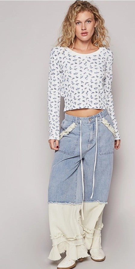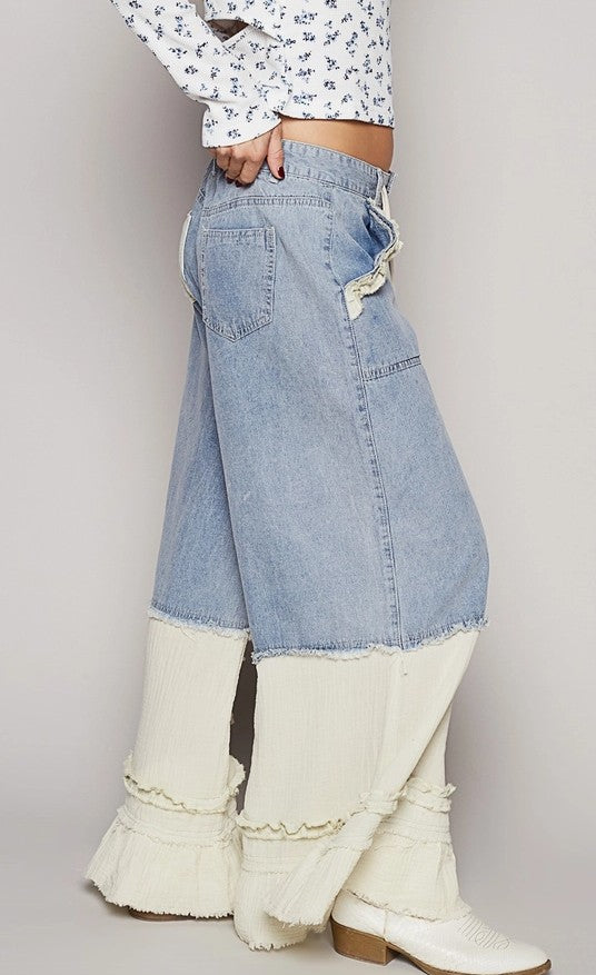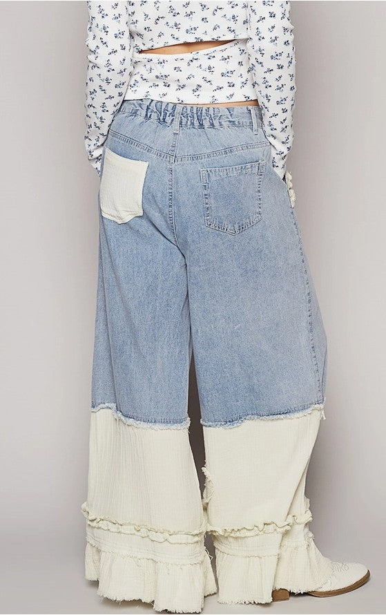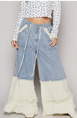 Designed in wide pants in twill with double gauze patch, outseam, flower patch point, shirring leg opening, waist loop, vintage washing, solid color. Specs/Dimensions: - WAIST: 13-1/2" - 15 1/2" (ELASTIC BAND) - FRONT RISE: 12-1/2" - BACK RISE: 16-1/2" - INSEAM: 27-1/2"