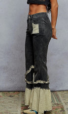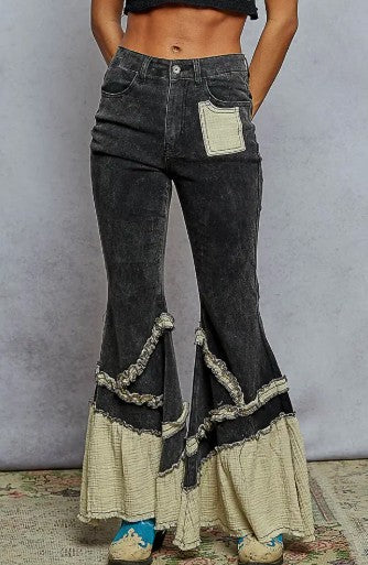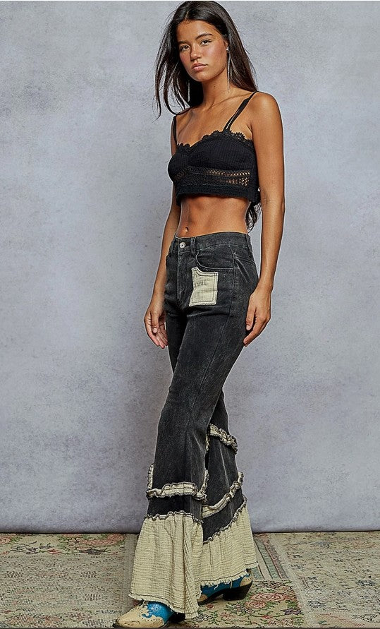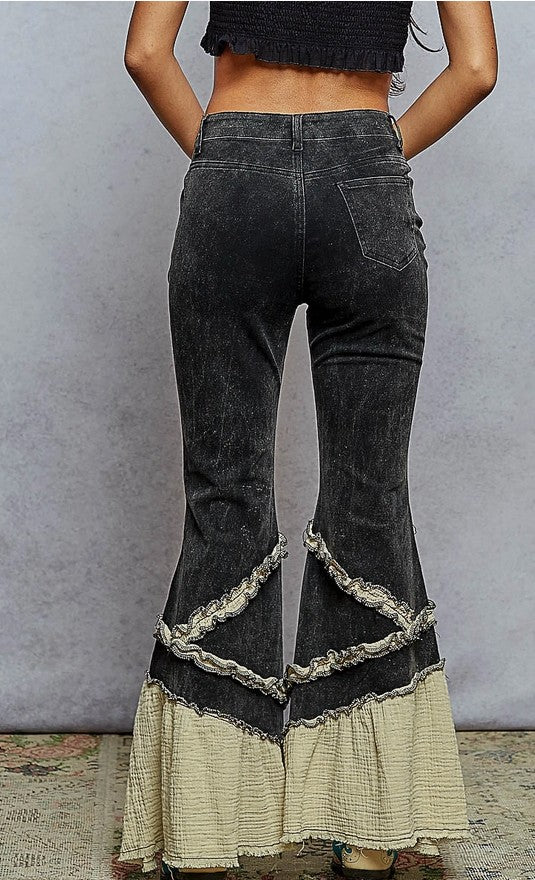 Designed in flared pants in stretchable denim/twill with double gauze reverse ruffle, overlocked edge point, raw edge, mini pocket point, vintage washing, solid color. Specs/Dimensions: - WAIST: 12-1/2" ~ 15" - RISE (Front): 11" - RISE (Back): 14" - INSEAM: 31"