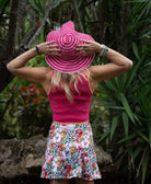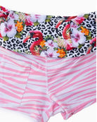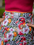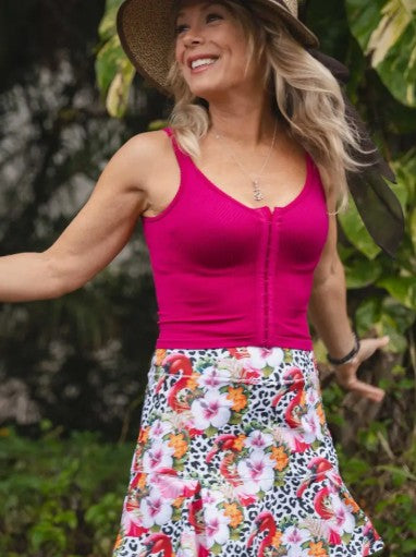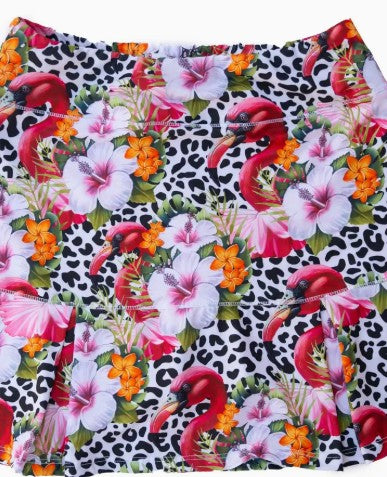 Our Flamingo Rhapsody design is sure to sell out fast. Vibrant colors on a snow leopard print background, with fun pink and white zebra print shorts underneath. Mid length. See measurements below. Perfect for playing tennis, comfortable for all day wear or dress it up with a pair of heels for a night out. Free gift with purchase! Sizes Small through XL available. Small (0/2) Medium (4/6) Large (8/10) , XL (12/14) Country Club Lengths: Small 15” / Medium 15” / Large 17” / XL 17”