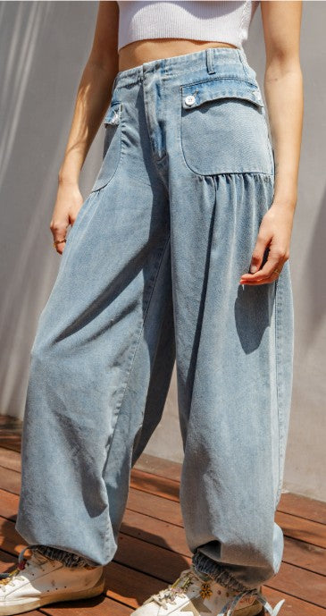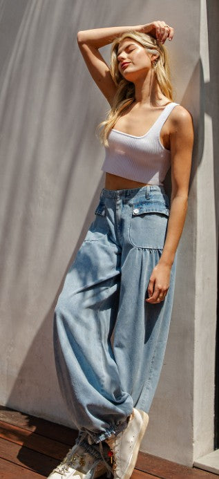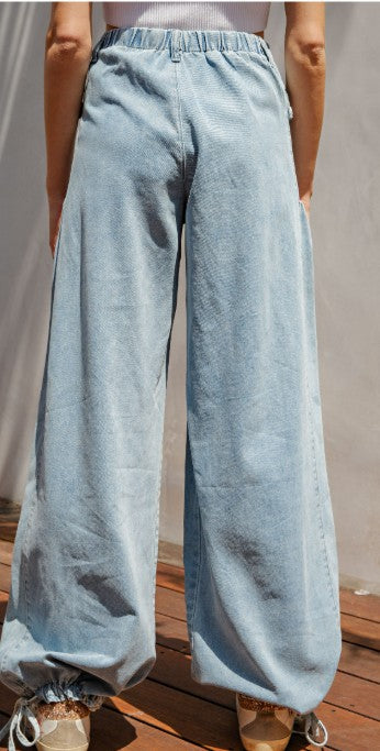 Solid denim wide leg pants featuring a drawstring cinch tie