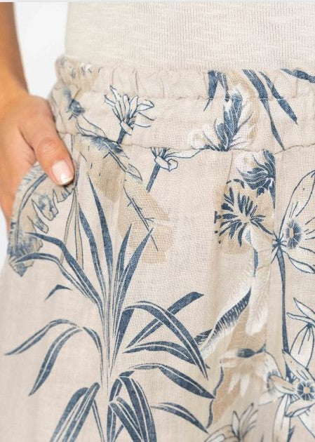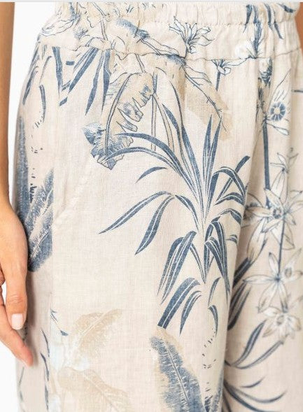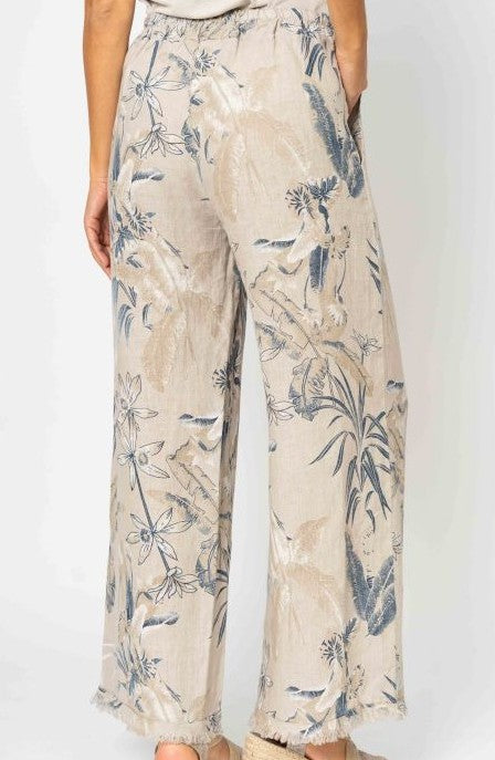 Printed Linen Pant raw edge. Elastic waistband. Banana leaf prints.
