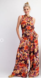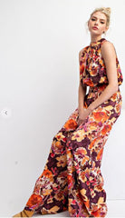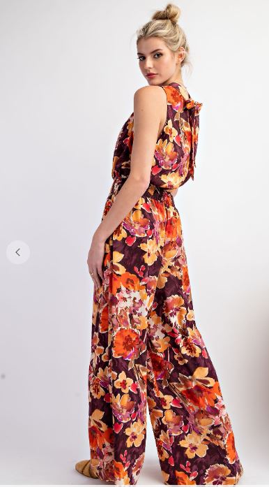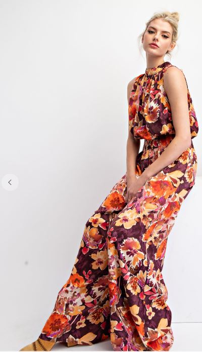 PRINTED MIRABELLE SATIN ROMPER PANTS -SLEEVELESS -MOCK NECKLINE -MAXI LENGTH -RUCHED DETAILING -SMOCKED WAISTLINE -WIDE LEG FIT -BACK ADJUSTABLE RIBBON CLOSURE -LOOSE AND RELAXED FIT -SMALL MEASUREMENTS : LENGTH - 40" & BUST - 18"