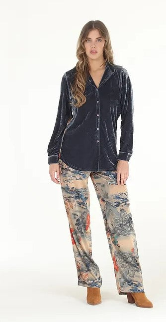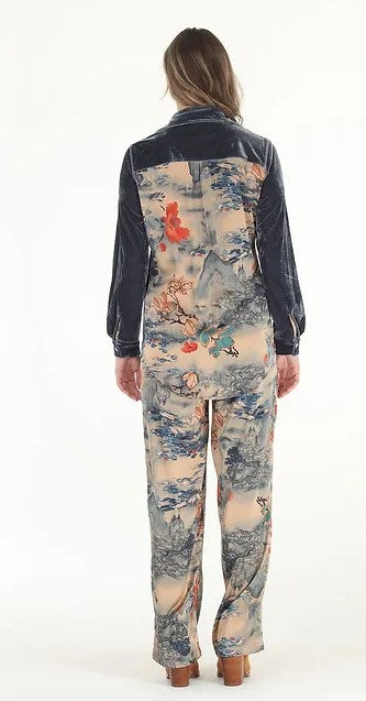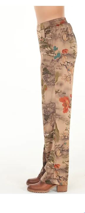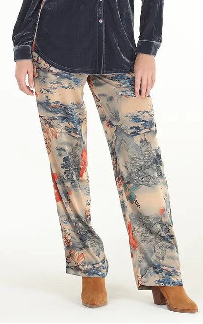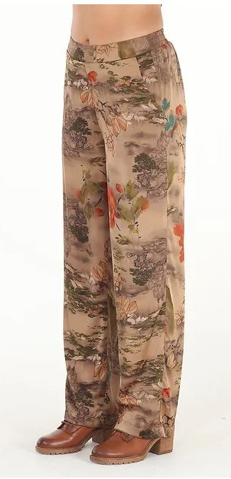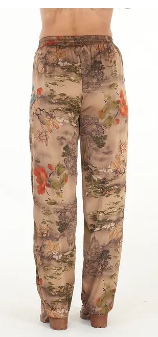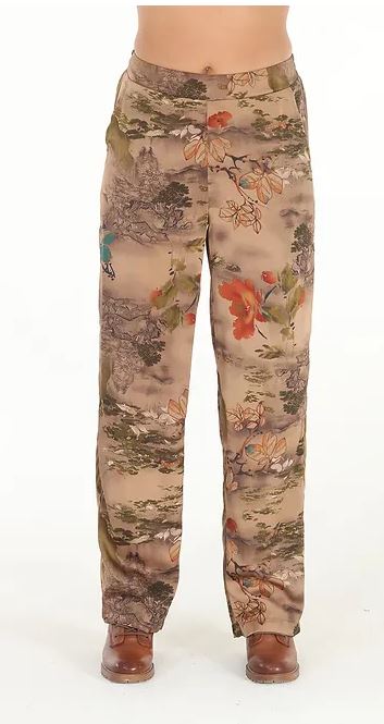 Elevate your boho-chic style with our floral print pants. These elegant pants feature a stunning eastern inspired landscape print in neutral and teal tones, perfect for adding a touch of eastern-inspired femininity to your wardrobe. The pull-on design with a half elastic waist and side slash pockets ensures both comfort and functionality, while the straight-leg silhouette effortlessly flatters your figure.