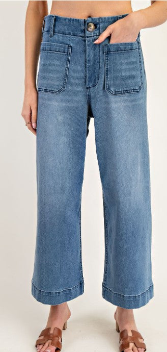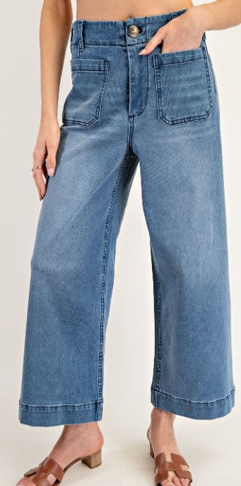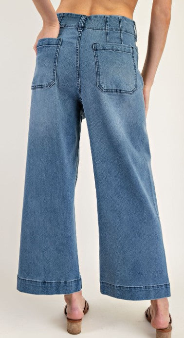 Denim pants featuring a button and zipper closure, belt loops,