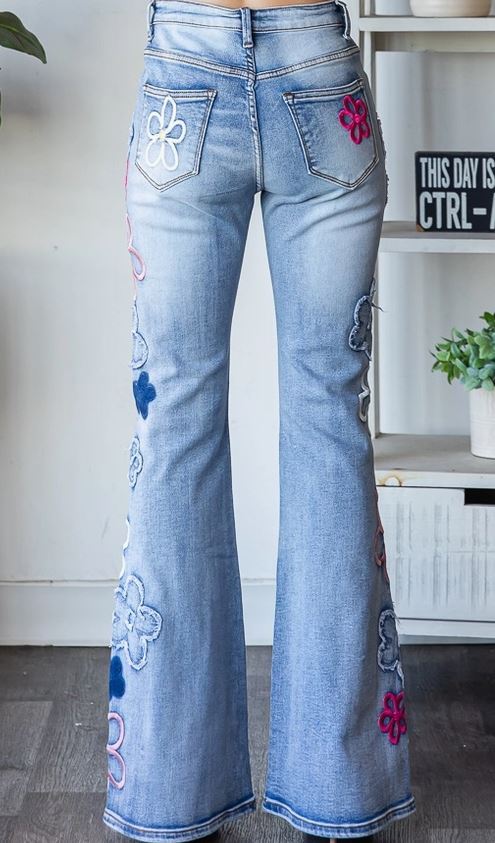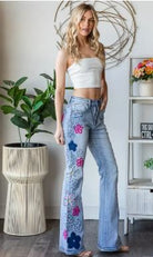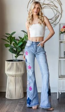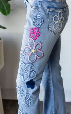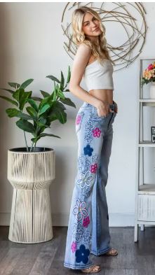 WASHED FLOWER EMBROIDERY DENIM PANTS - MINERAL WASH DETAIL - RELAXED FIT - TRUE TO SIZE - OUR MODEL IS ALWAYS WEARING SIZE "S" - FABRIC CONTENT: 75% COTTON 23% POLYESTER 2% SAPNDEX
