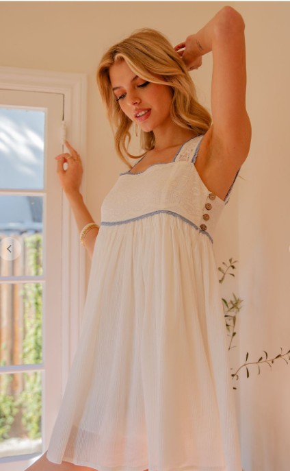 trims, a square neckline, button fastening on the side, and a charming