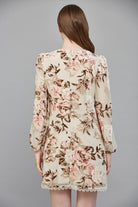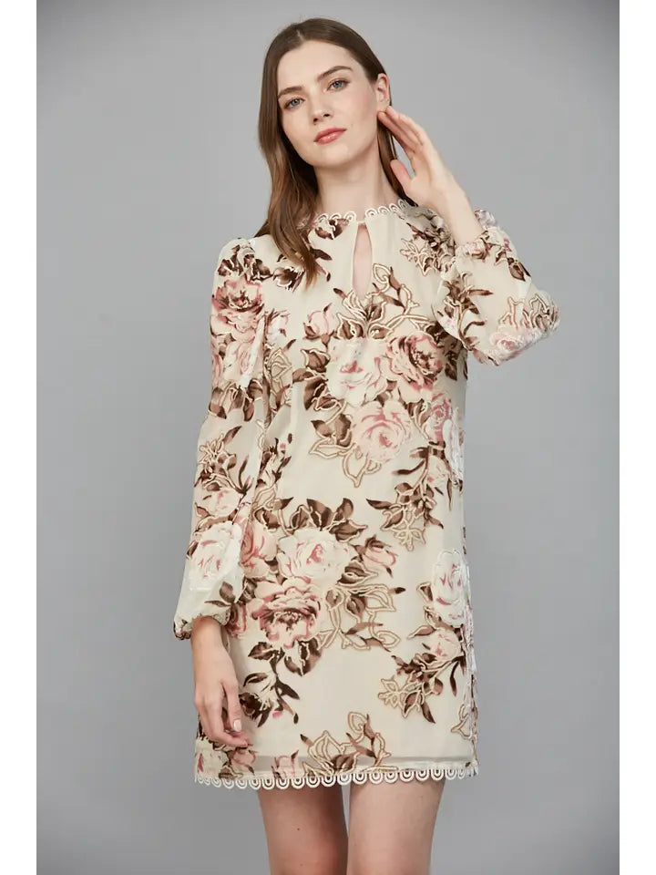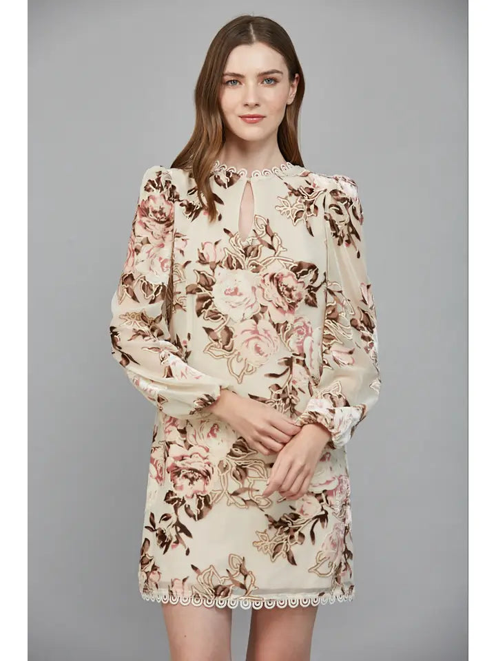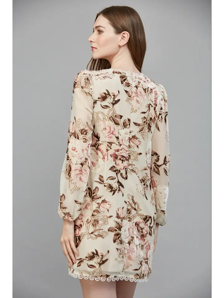 Long sleeve mini dress with scallop tape 52% rayon 48% nylon 97% polyester, 3% spandex Model height: 5’ 8”