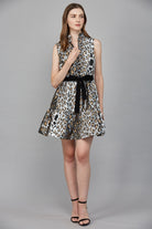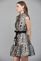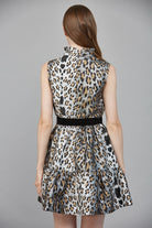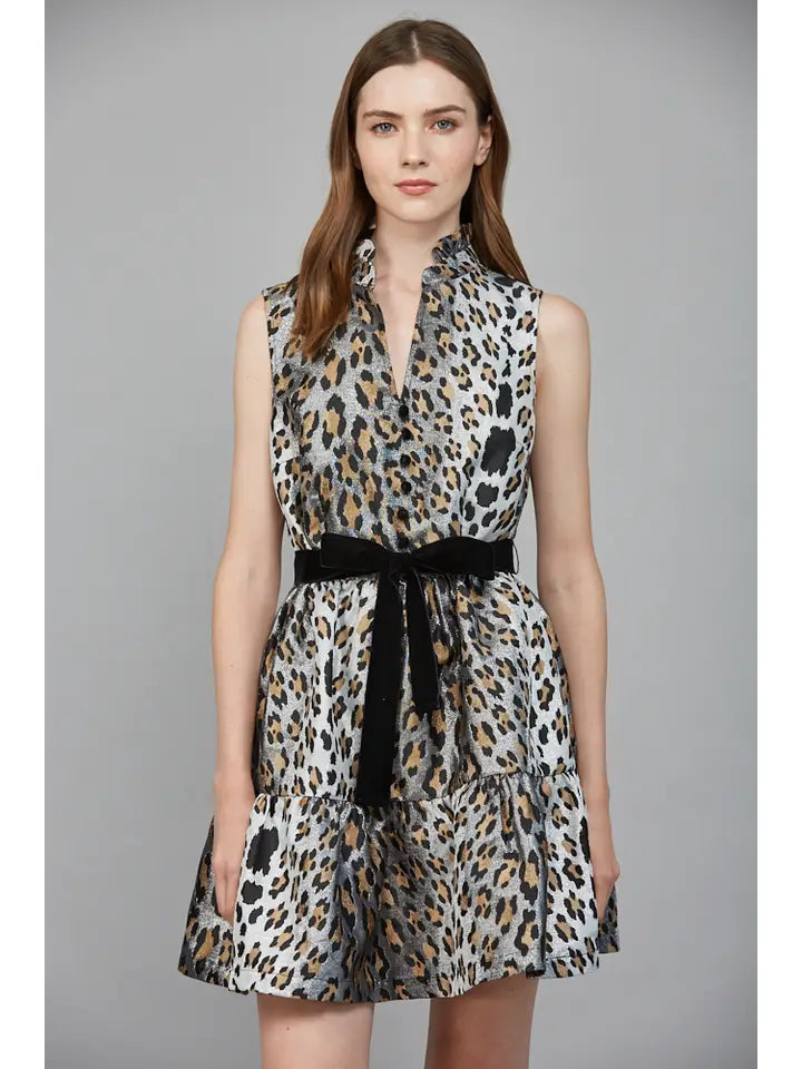 Metallic animal print tiered sleeveless dress 100%poly, 97% polyester 3% spandex