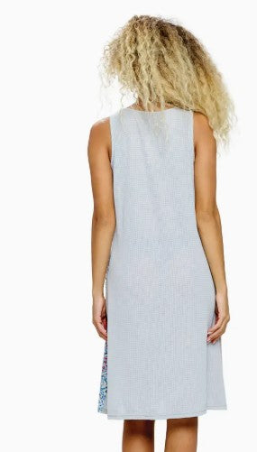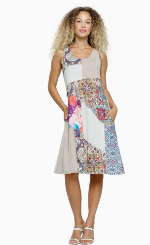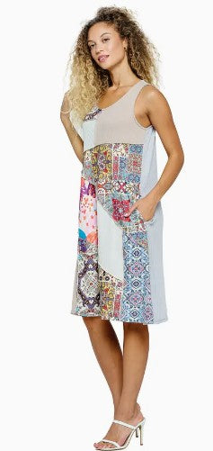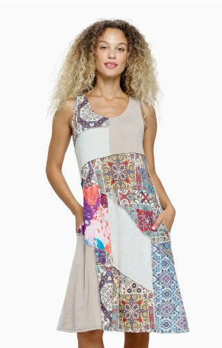 – Spring Summer Patchwork Dress – Boho Textured Dress – Gypsy Groovy Boho Look – Casual Style – Loose Fit A-Line – Flowy Easy Fit – Relaxed Silhouette – Color Contrast – Inseam Pockets – Round-Neck – Sleeveless – Midi Length – 60% cotton 40% polyester – Made in Nepal Measurements : Length- S 38”, M 39”, L 39.5”, XL 40” Chest- S 36”, M 38”, L 41”, XL 44” Hem - S 56”, M 58”, L 61”, XL 64”