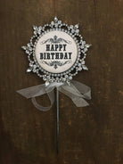 Cake topper happy birthday. 7.5 x 4 inches made with rhinestones and button center. Cake topper or plant pick.