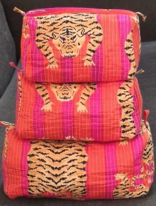 These beautiful quilted Cosmetic Bags comes with 3 different sizes. They are washable, which is awesome. They are handmade in India