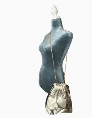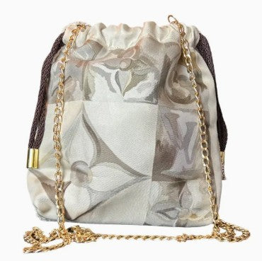 Vintage finds exclusively ours. Our vintage Louis Vuitton scarf drawstring bags are sustainably sourced, locally made with a history and story to be told. Reimagined from the world’s finest collection of vintage Louis Vuitton scarves, our drawstring bag is the ultimate accessory for your on-the-go lifestyle. Uniquely convertible from a crossbody to a handheld bag with both removable goldtone chain and silky drawstring cord. Limited editions to stash all your essentials in our generously sized fully lined bag with interior pocket, drawstring closure and removable crossbody chain. Each piece is unique due to print placement – let us choose for you.