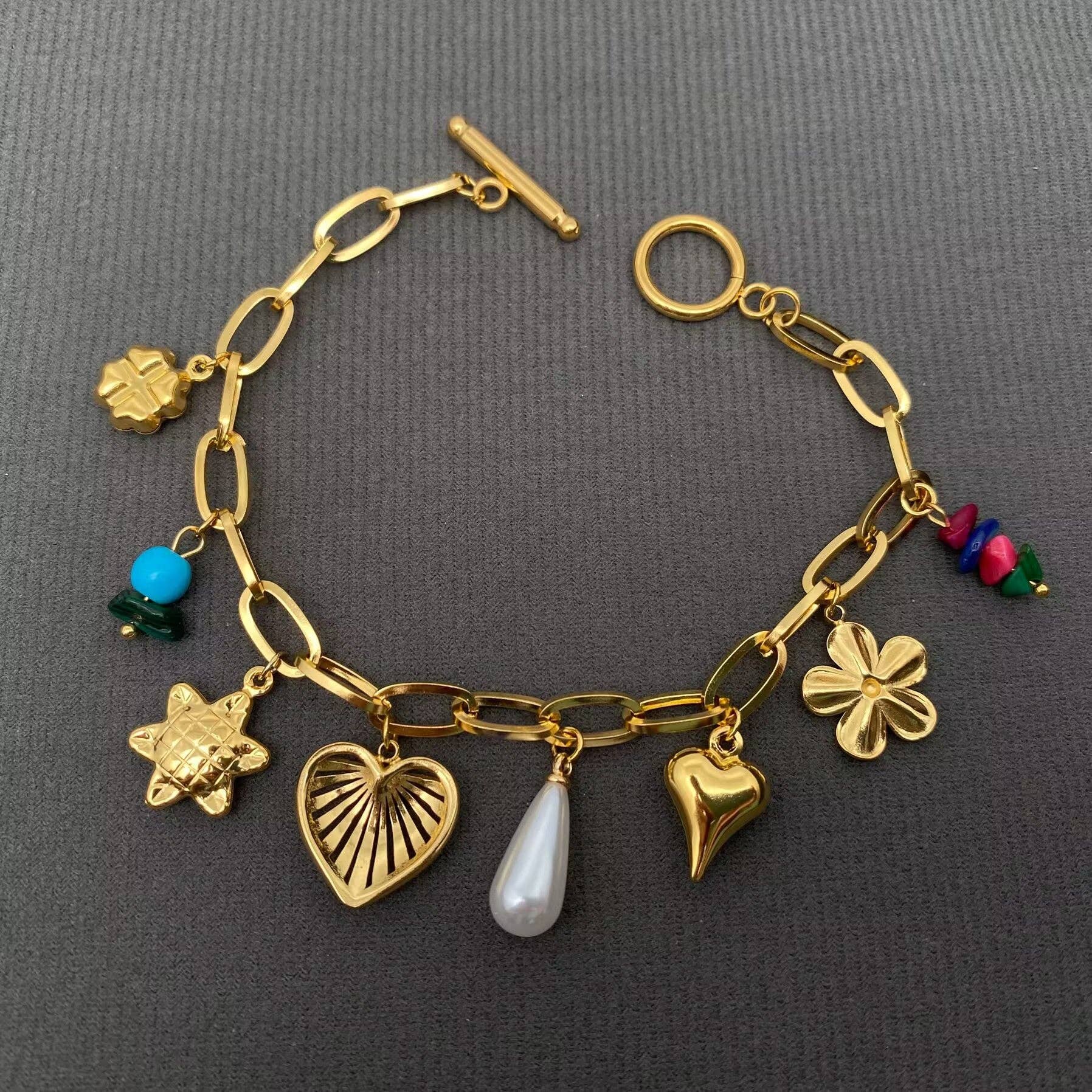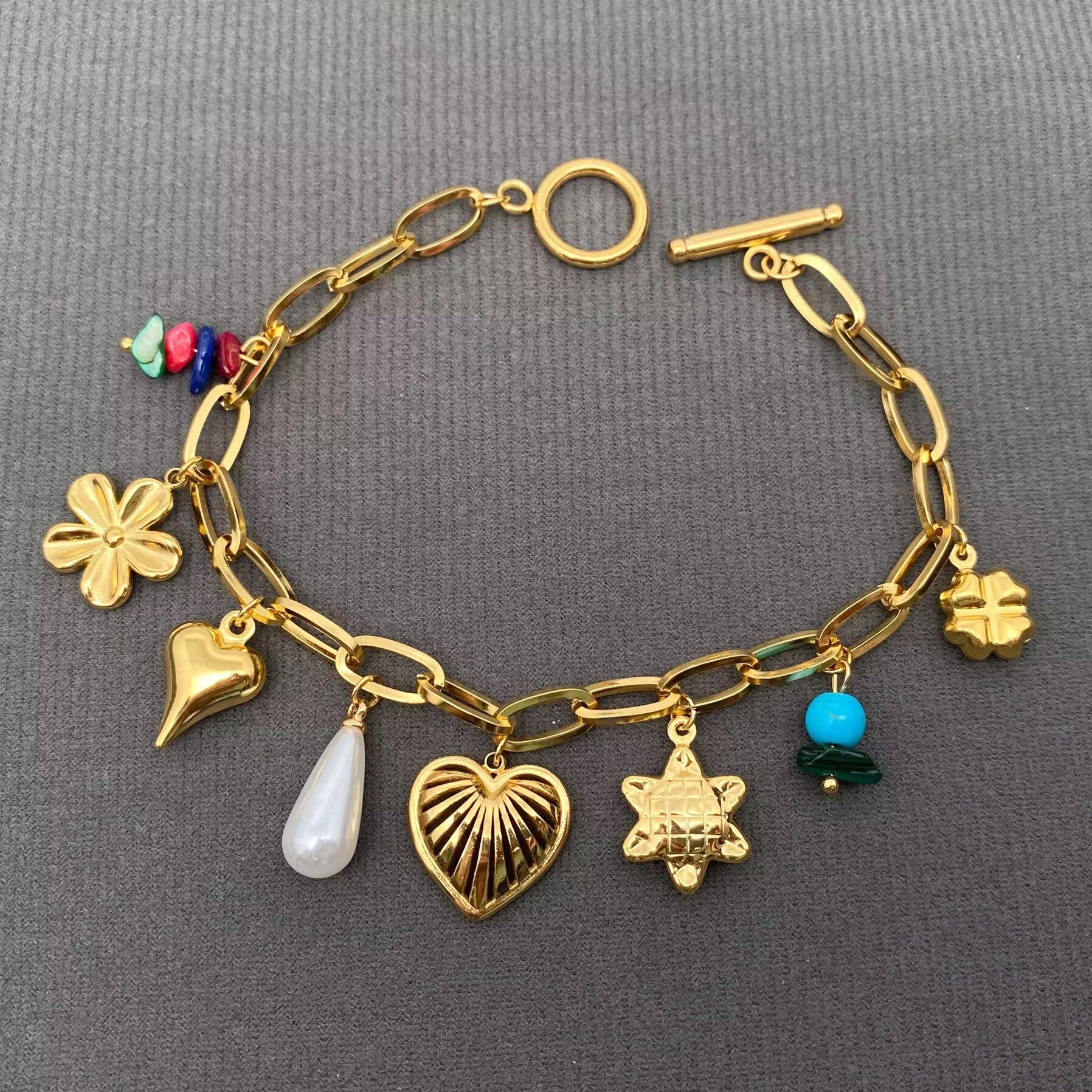 Type: Bracelet Material: Stainless steel,Resin,18K gold plated Size of pendant : 10mm ~18mm Length of chain : 205mm Process: vacuum electroplating and manual polishing, Non tarnish Surface : High Polish ★Made of high quality stainless steel, Lead-free ,Harmless to Human Body. ★Perfect jewelry gifts