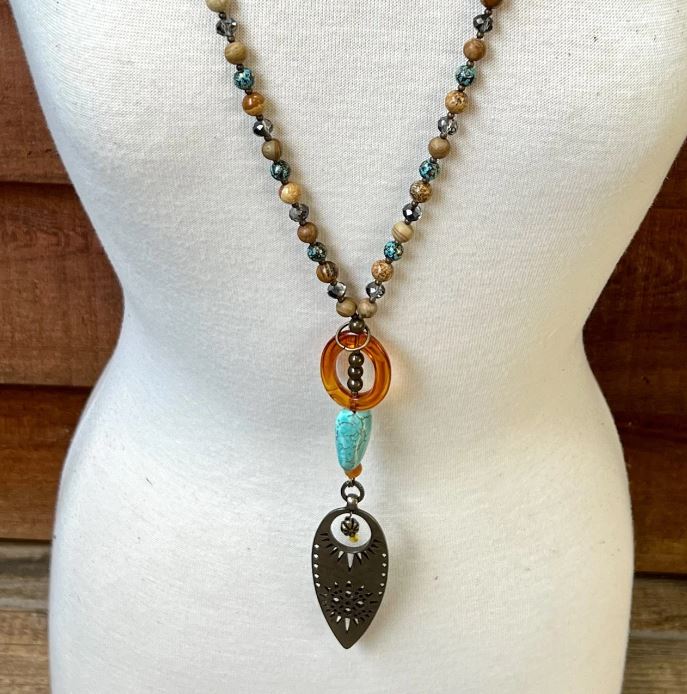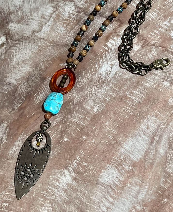 Thick, bronze chain link necklace. Can be worn long or short by hooking the lobster claw to the hoop. This necklace includes unique beading and a hanging pendant.