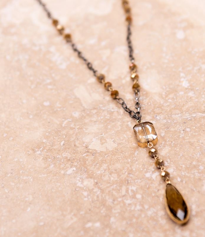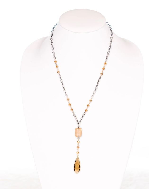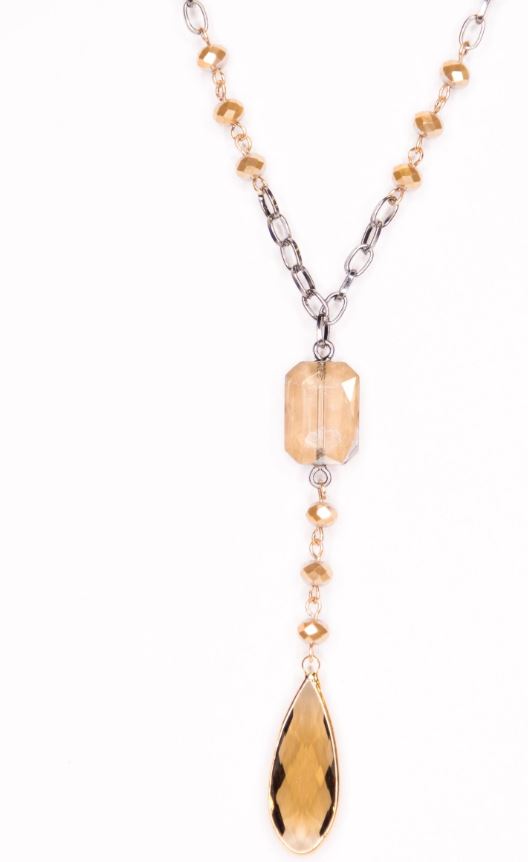 Long lariat style necklace with beautiful beading throughout the chain. The lariat features a rectangle crystal charm and a teardrop crystal charm. 14" length