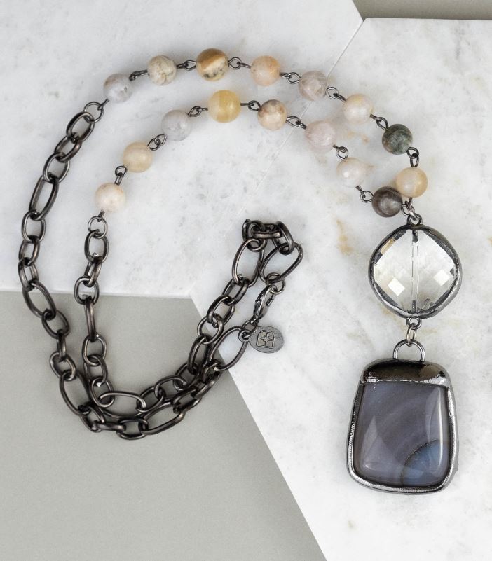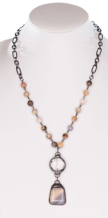 Medium length half-chain, half-beaded necklace with double charm pendant. Beads are made of natural bamboo agate stones. Length