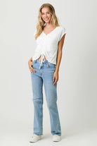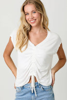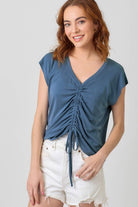 Front Ruche Modal Top Ruched front with drawstring Cap sleeves V-neckline -Model is wearing a size Small / Model height: 5` 8"