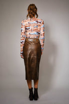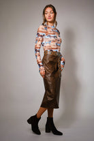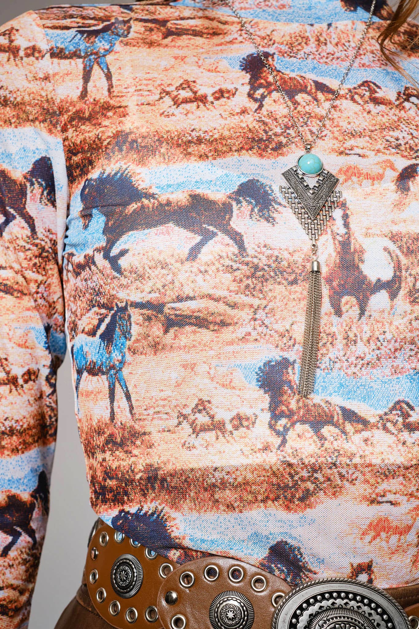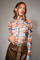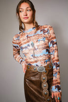 Long sleeve fitted top with western horse print, mock neckline, and sheer mesh fabric for a bold layered look. Stretchy fit for comfort 95% Polyester, 5% Spandex Model is 5'8" tall and wearing size Small