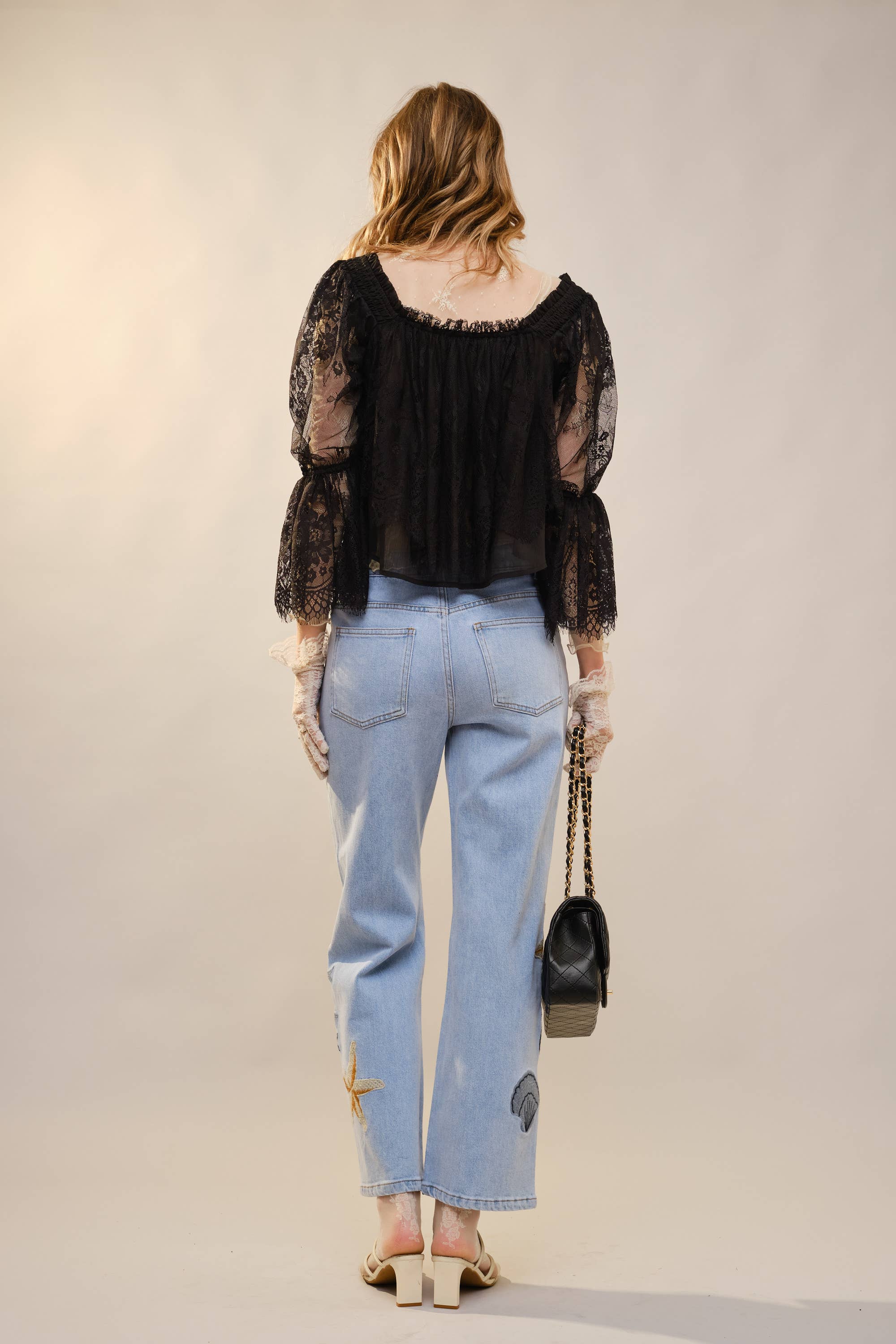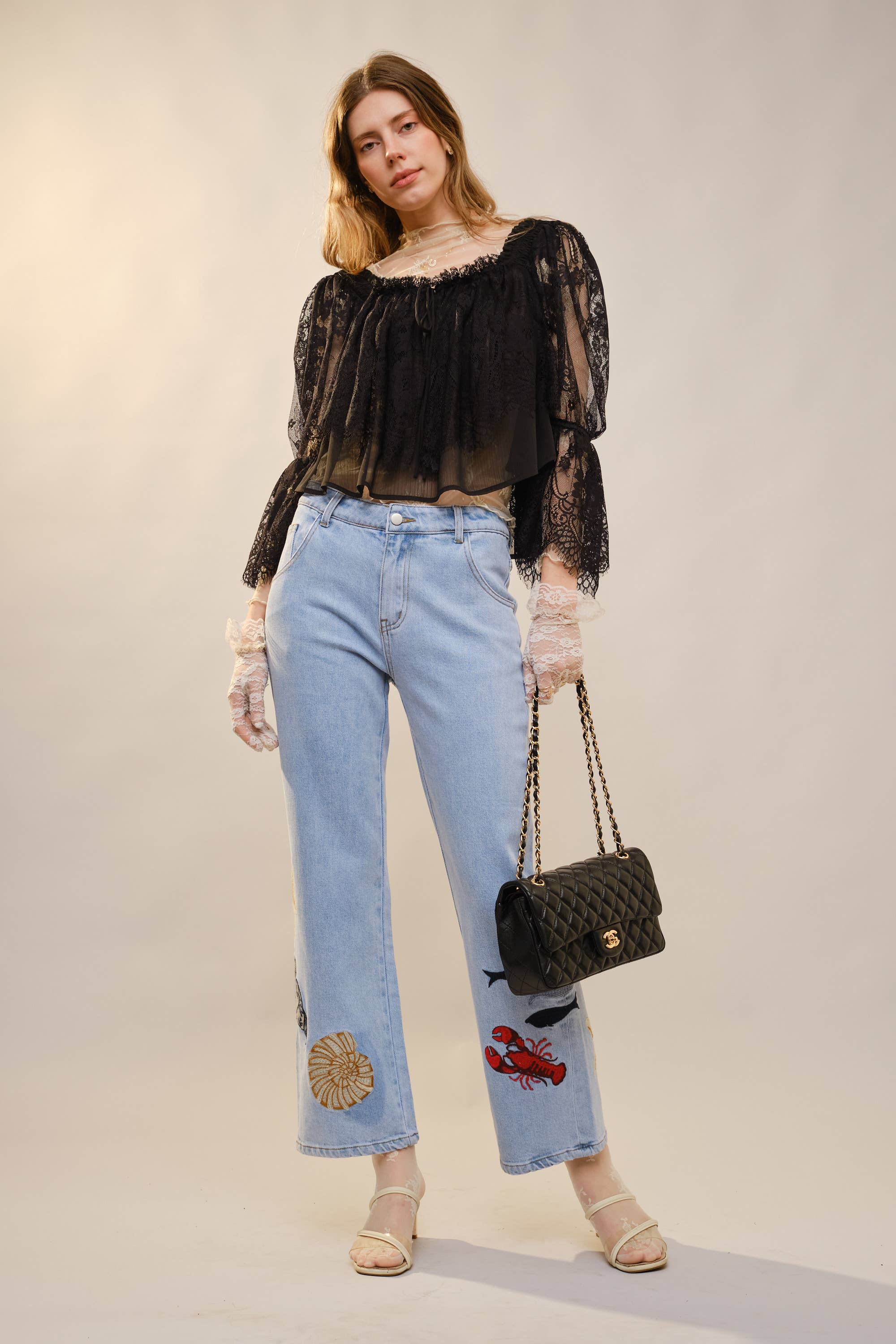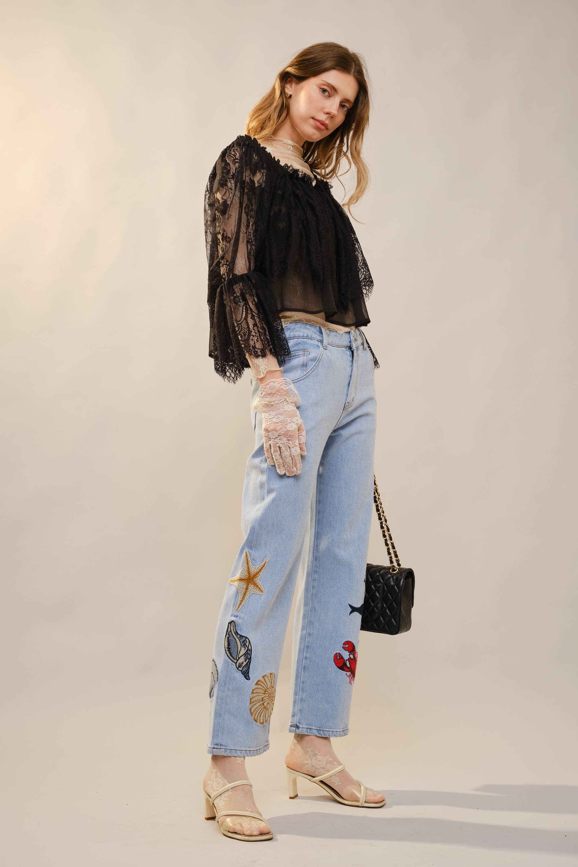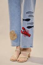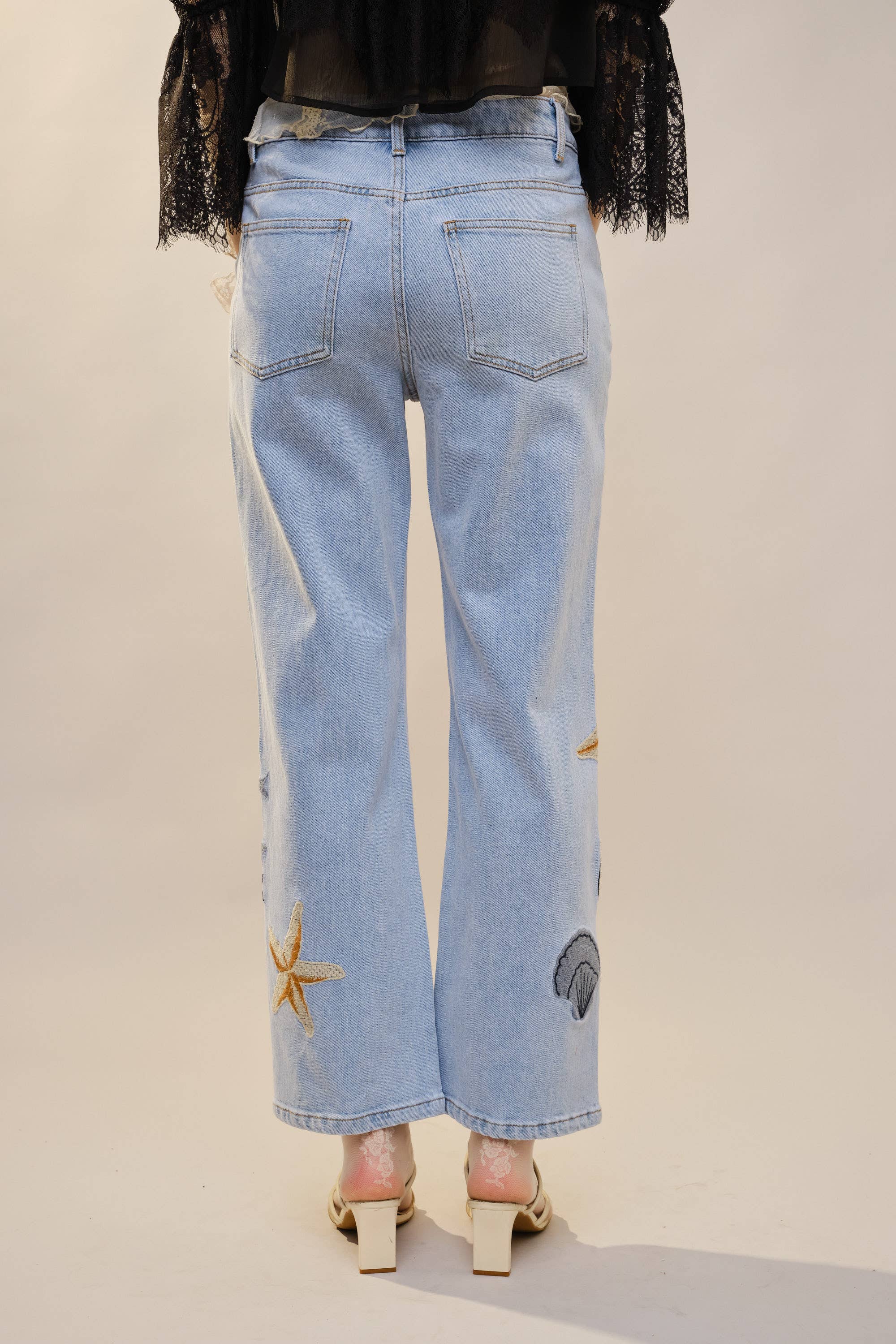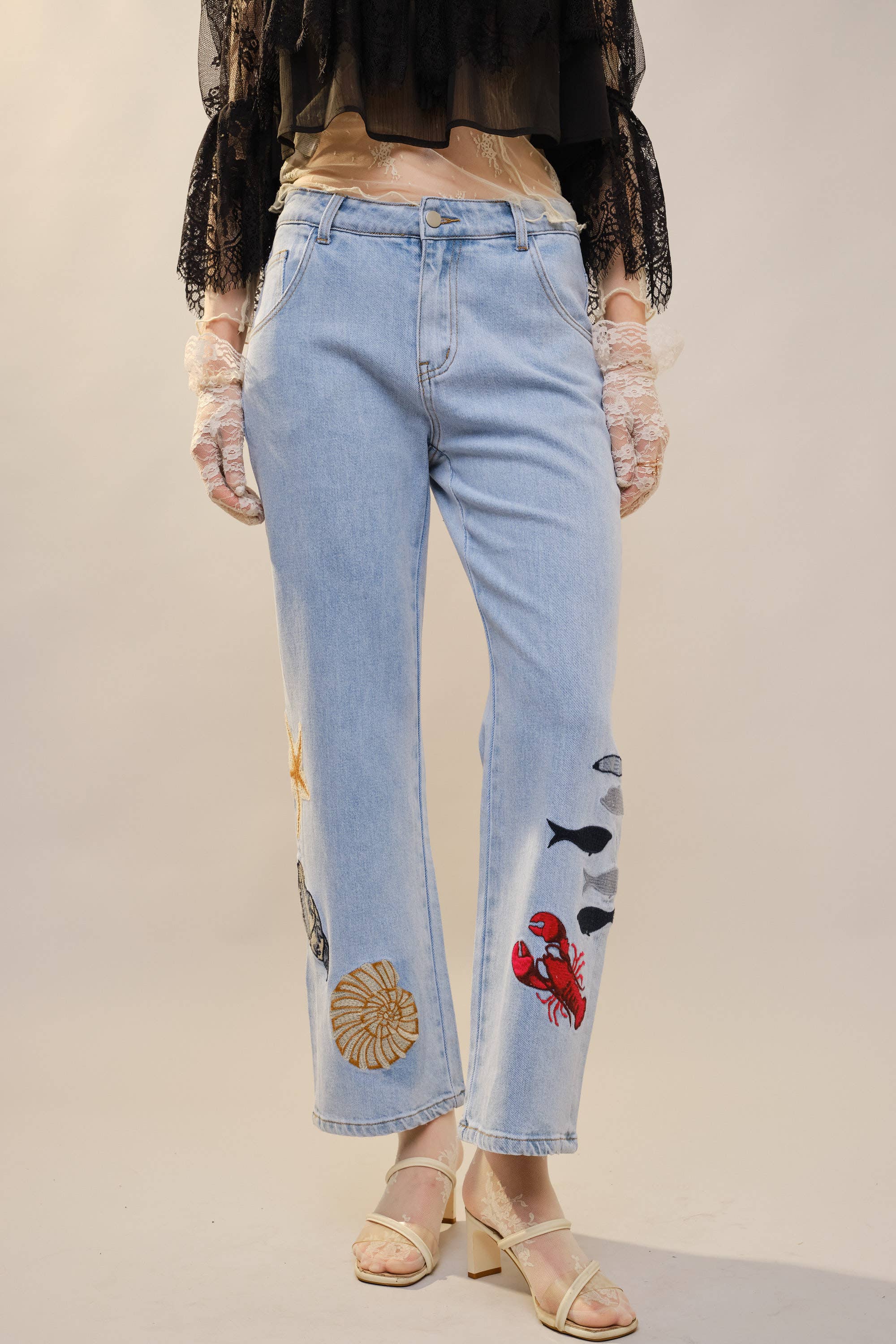 High rise straight leg denim jeans with ocean-themed embroidery throughout the legs, finished with a clean hem and a slight stretch for comfortable wear