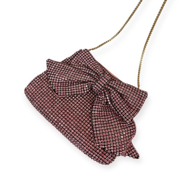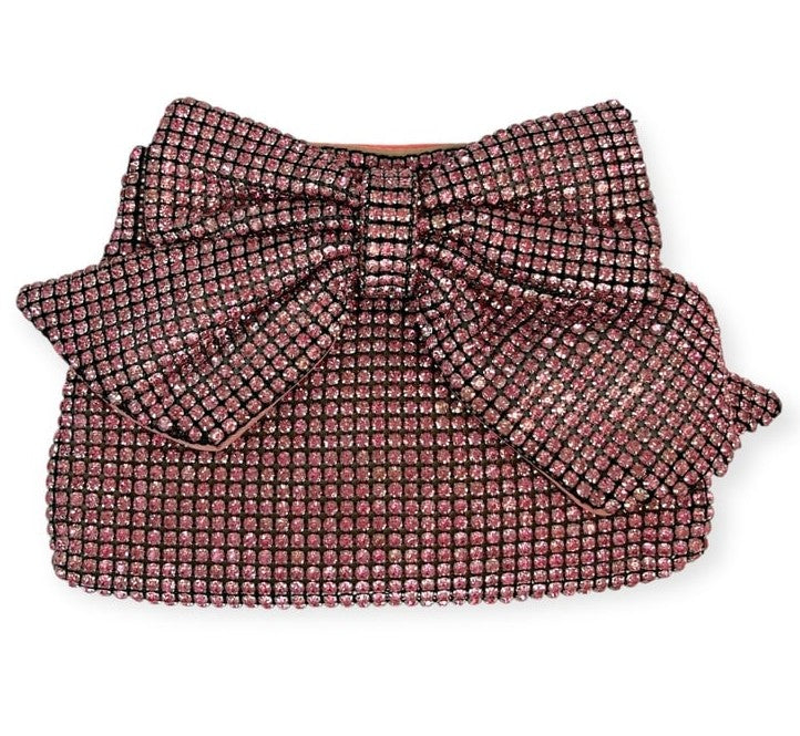 This adorable pink rhinestone bag will definitely make heads turn when you put it with your outfit. It has rhinestones front and back. It is a Patent Bow favorite!