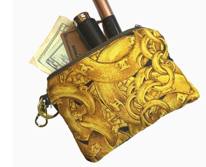 Vintage finds exclusively ours. Our vintage Chanel scarf Coffee Run Keychain Bags are sustainably sourced, locally made with a history and story to be told. Reimagined from the world’s finest collection of vintage Chanel scarves, our Coffee Run Keychain Bag is perfectly sized for when you only need your credit card, a few bills, and your lip gloss. Limited editions, the ultimate accessory for our on-the-go lifestyle, this charming piece stashes all your essentials in a zippered bag with a gold-tone removable keychain. Each piece is unique due to print placement - let us choose for you. Dimensions 4"H x 5"L Scarf Designed By Chanel Design Studio Year of Introduction Unknown Color Black, Gold & Red Materials Vintage Chanel 100% silk scarf front with black & gold tweed reverse. Fully lined, zipper closure with removable gold-tone keychain and lobster clasp. Non-Affilitation Trademark Disclaimer Exclusively ours, all items are sourced and altered from independently authenticated secondary market sources to preserve their beauty while reducing waste and its impact on the planet.