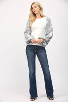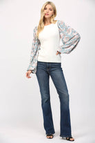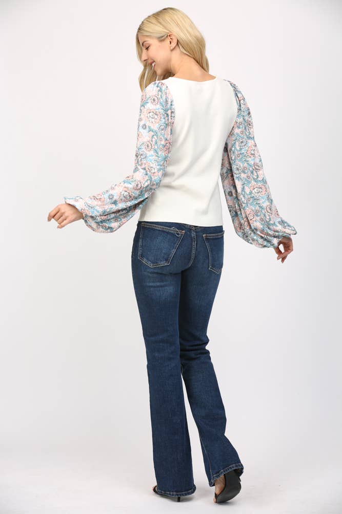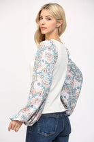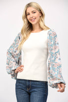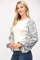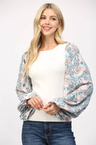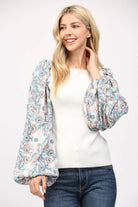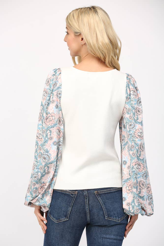 CONTRAST PRINT BALLON SLV ROUND NECK SWEATER