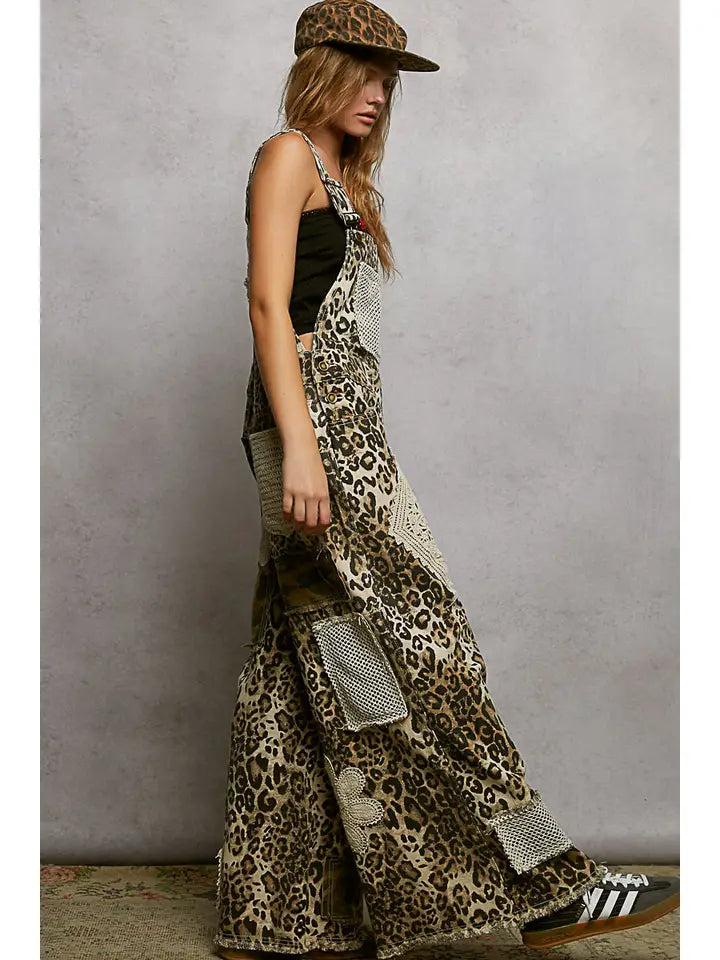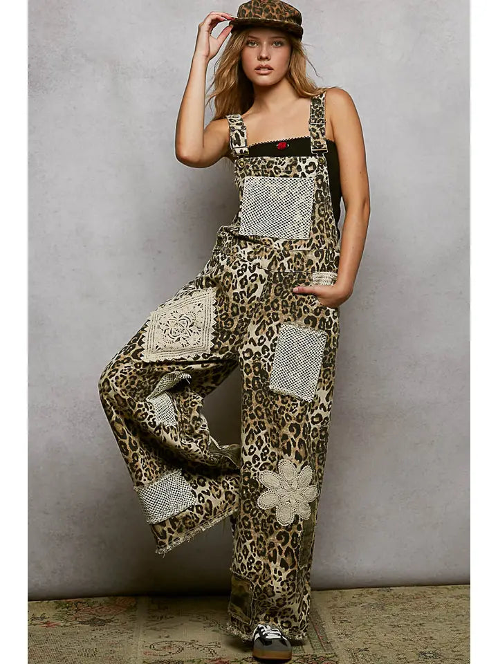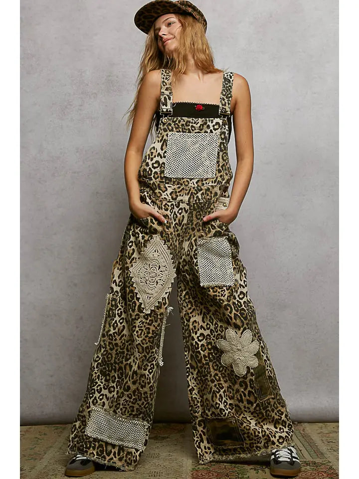 Designed in roomy fit overalls in printed twill with varied crochet patches, mesh overlay pocket and patch accents, and adjustable straps. Specs/Dimensions: - WAIST (Bottom Band): 18" - INSEAM: 28-1/2"