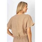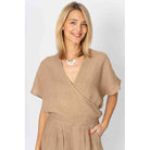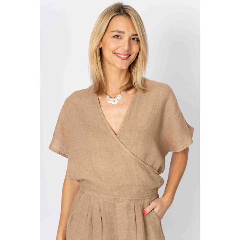 This effortless wrap-style top is crafted from lightweight linen for a breathable, natural feel. Designed with a flattering V-neckline and relaxed short sleeves, it offers an easy, elegant silhouette that works seamlessly from day to evening.