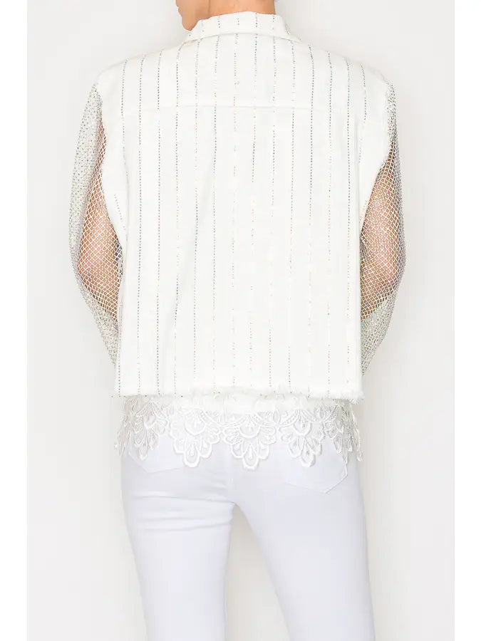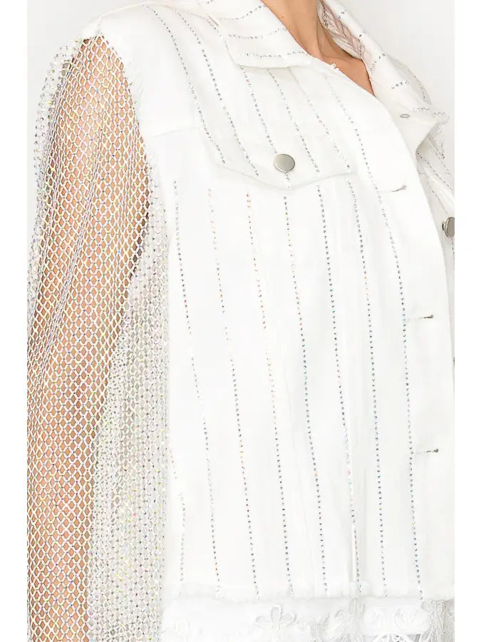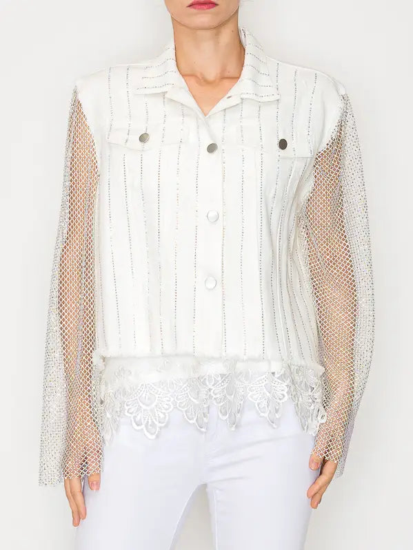 This denim jacket stands out with its distinctive mesh stone sleeves, adding a touch of elegance to a traditionally casual piece. As a brand, Origami Apparel draws inspiration from lace and crochet, creating stylish and on trend clothing. This jacket is a perfect example of our commitment to innovative design, blending the timeless appeal of denim with the intricate beauty of mesh stone detailing.