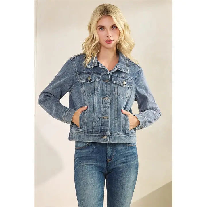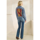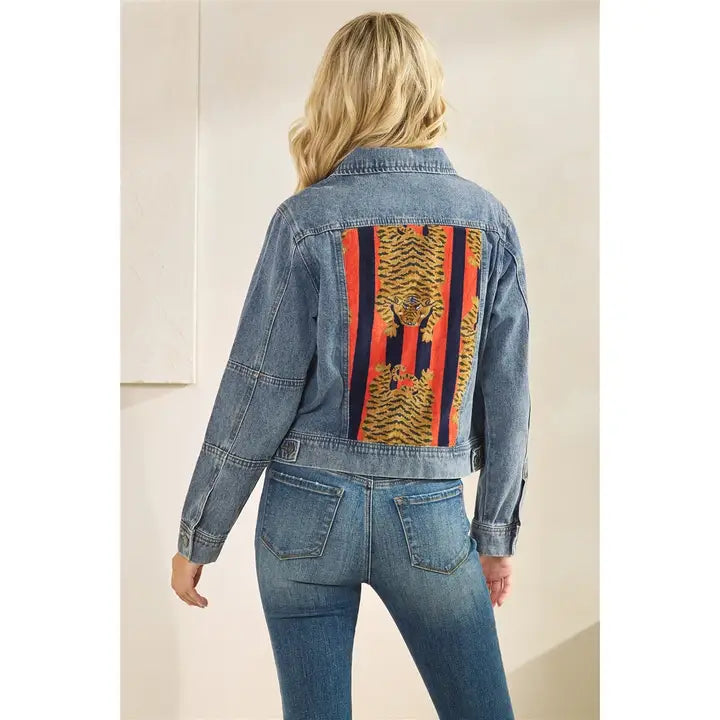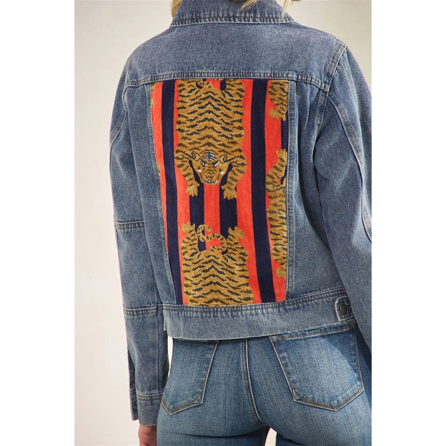 Fitted Denim Jacket with Back Tiger Patch Print Hand Wash Only Model is 5'9 and wearing a size small