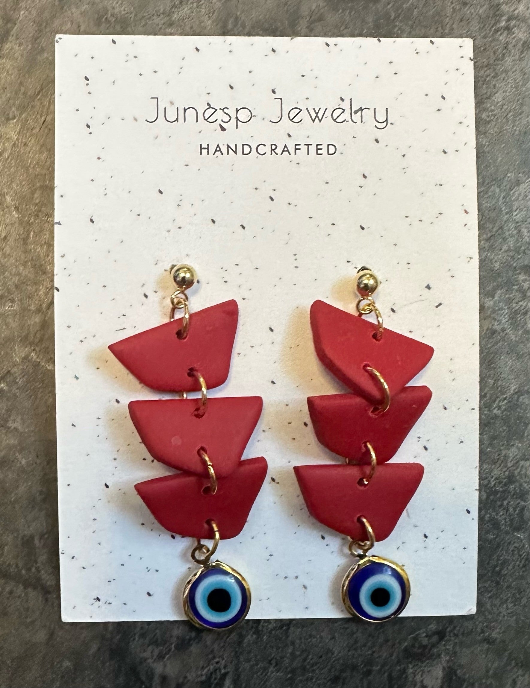 Made from Polymer Clay with gold metal. Dangle Evil eye made from our local artist