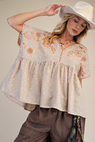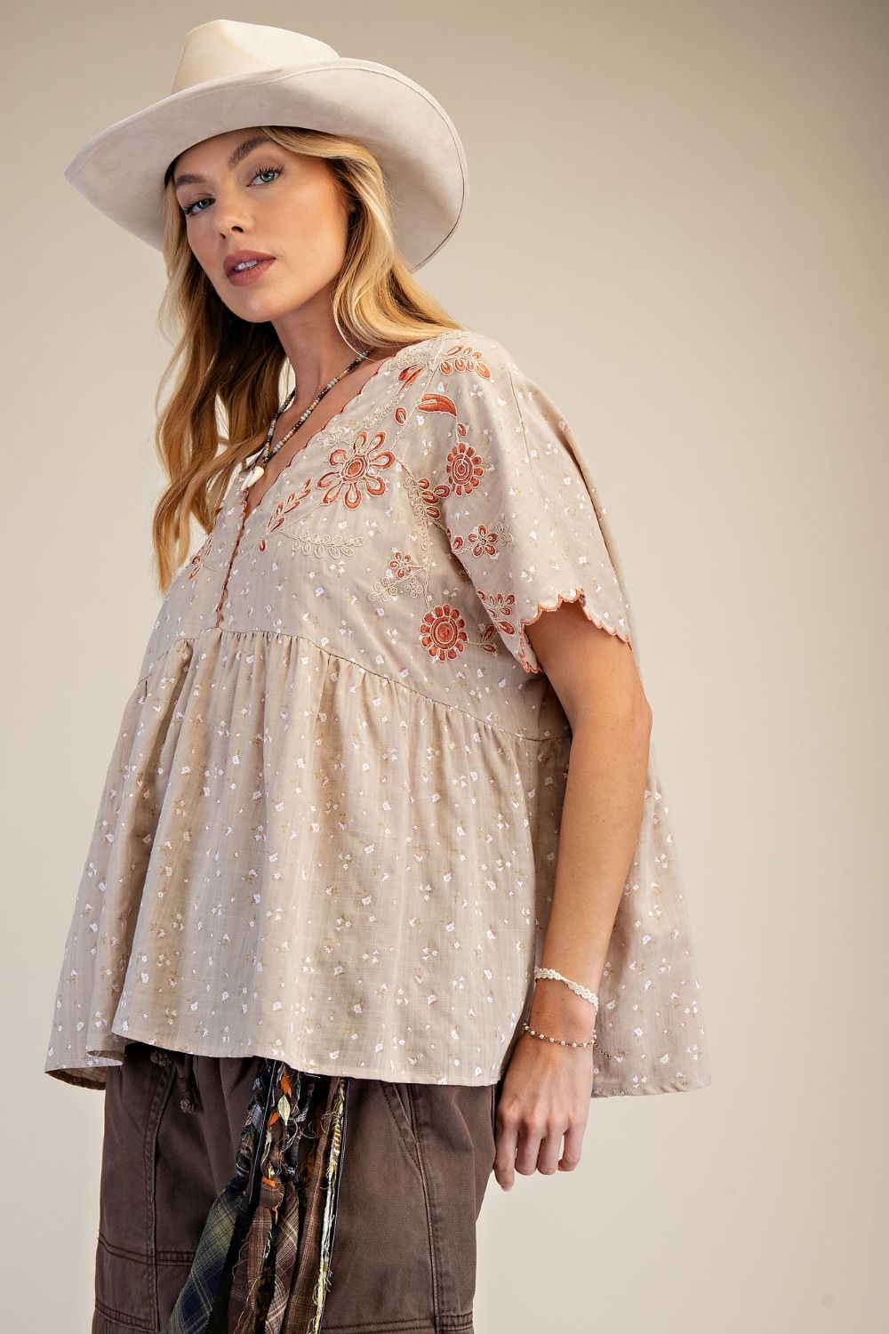 Description: FLORAL EMBROIDERY DETAILING BABYDOLL TOP