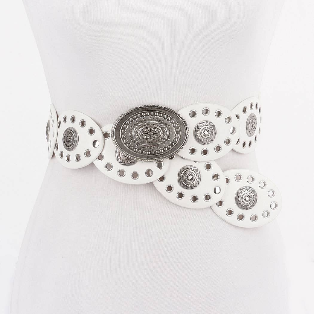 Introducing the "Silverwood Oval Belt" - a stylish accessory that features a combination of silver metal buttons on a faux leather belt. Elevate your outfit with this vintage-inspired piece that adds a touch of elegance to any look.