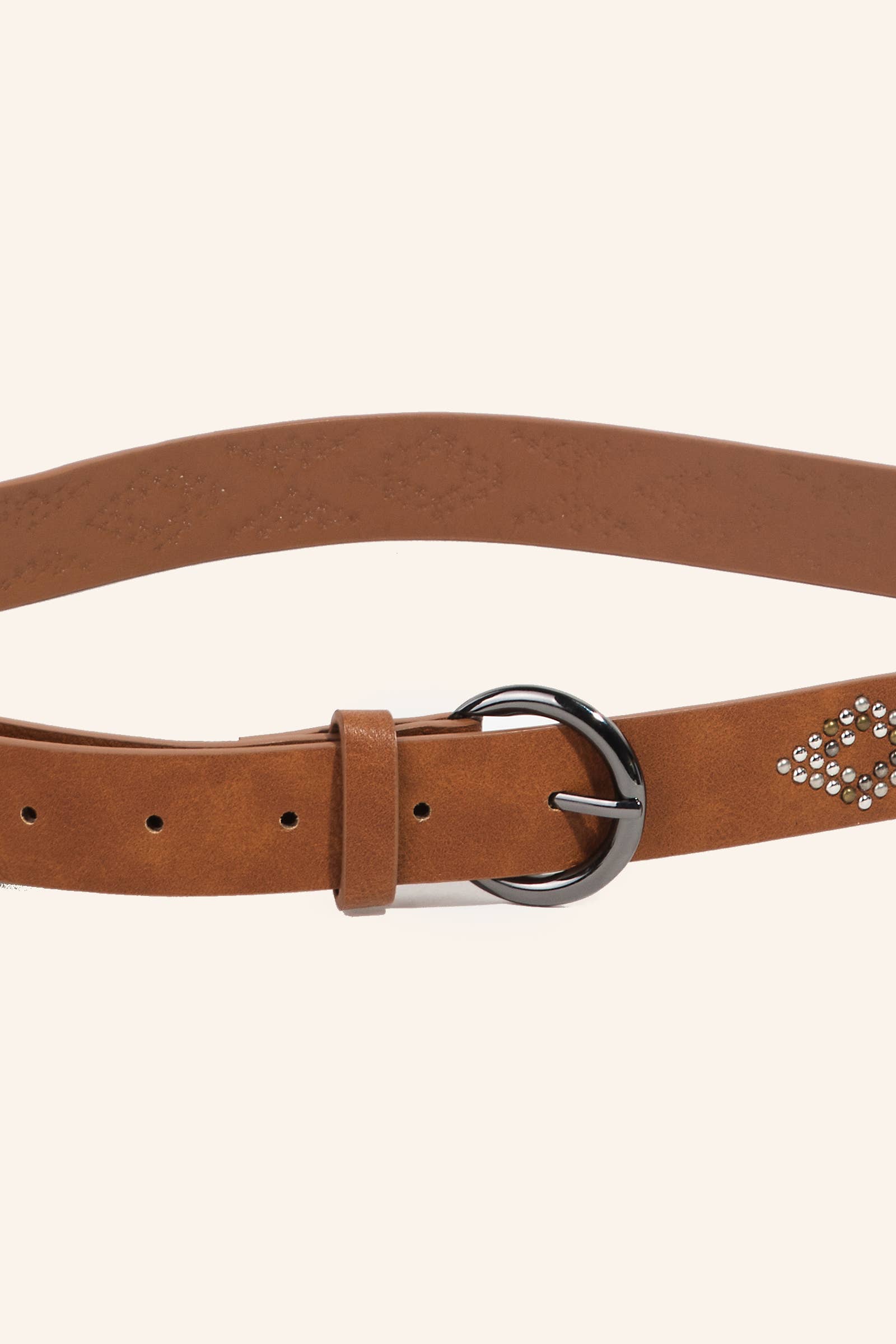 This piece is designed to make a statement, this faux leather belt features a distinct geometric studded design. Add a touch of glamour to your wardrobe with this versatile faux leather belt, perfect for enhancing the elegance of any look. This faux leather belt approximately measures: Length: 41 Inches This faux leather belt is made with 100% Pu.
