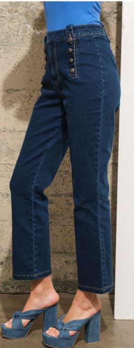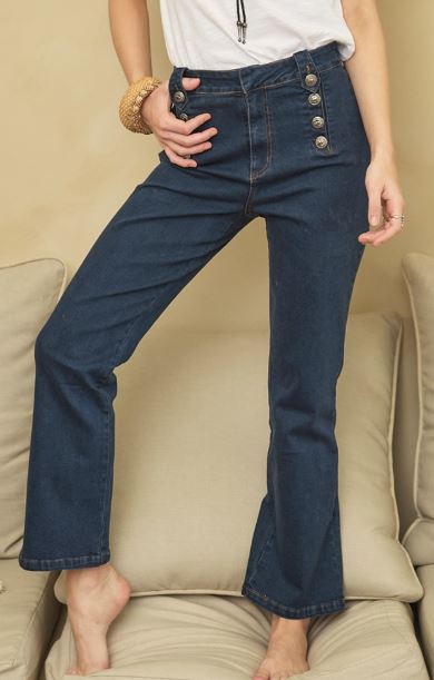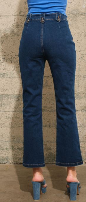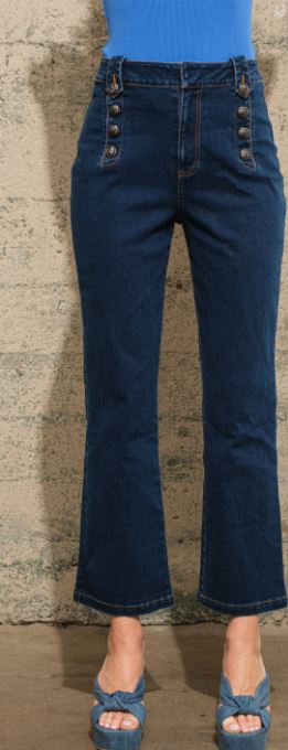 Flare Denim Trousers Featuring High waisted. Cropped leg. Flared leg. Gold sailor button detailing. Zip fly. Button closure. Flat front. Belt loops