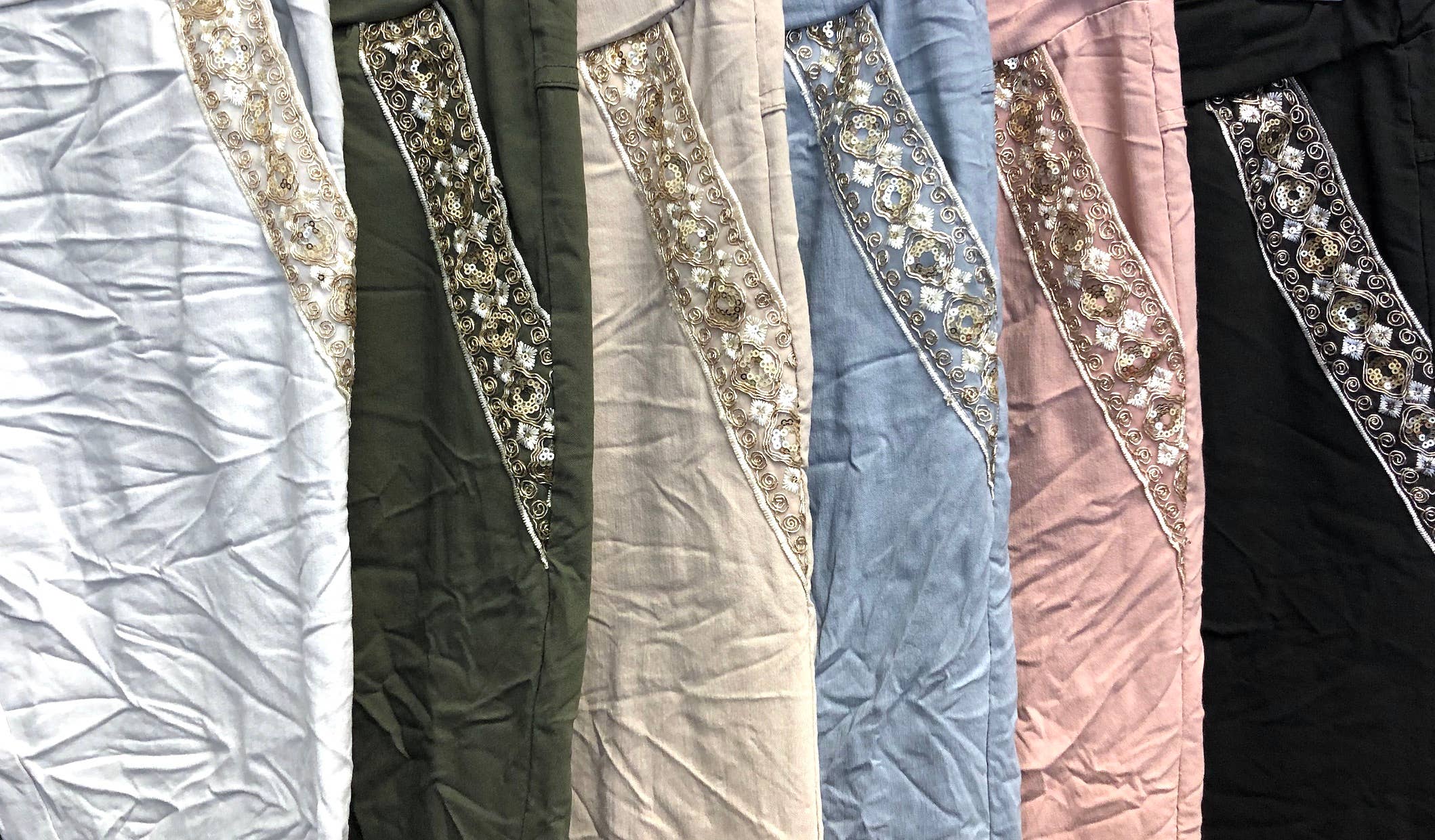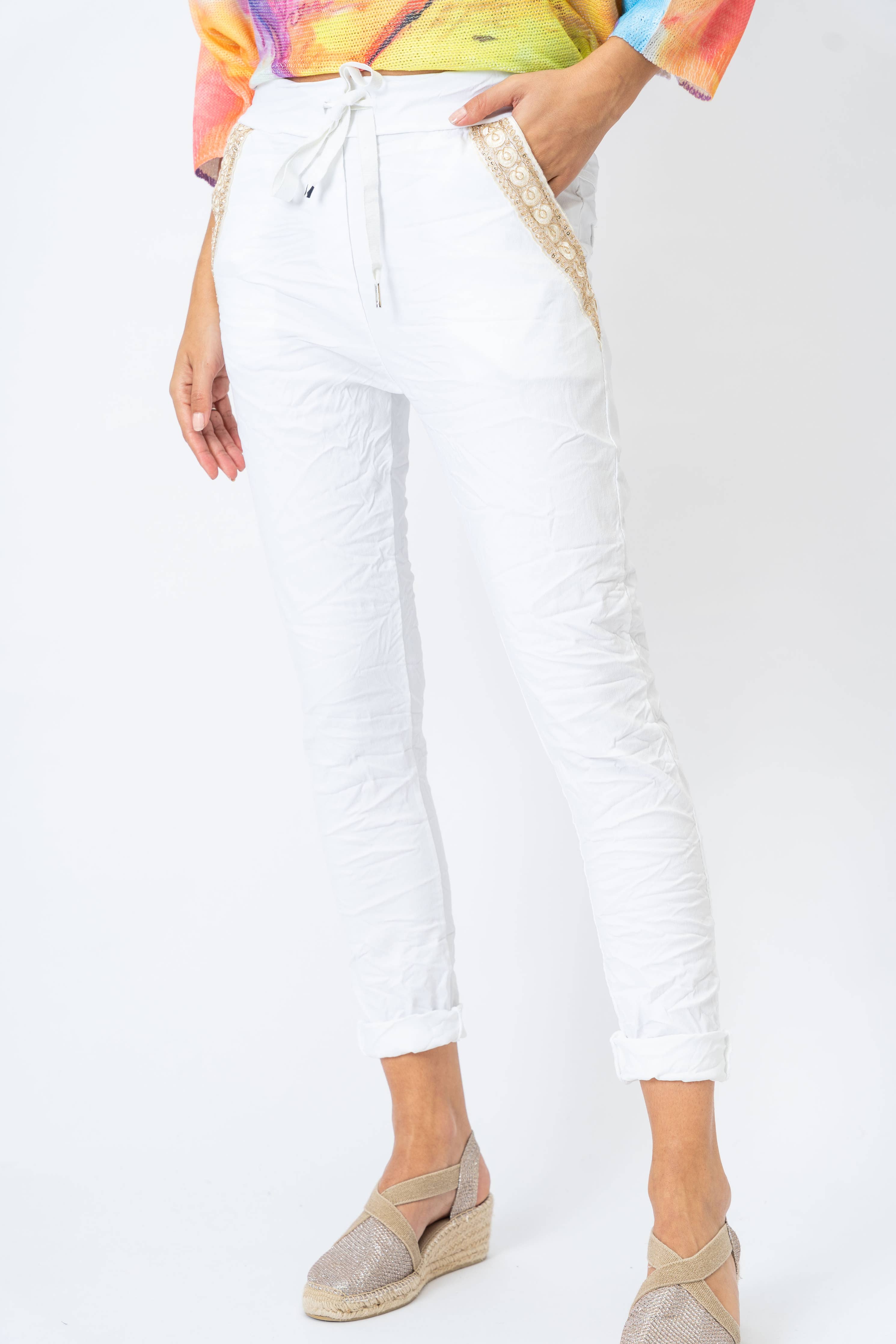 Gold Sequin Embellished Pant. Elastic tie waistband, gold sequin and ribbon on trim of pockets, two front and back pockets, solid color on front and back. One Size 95% Viscose 5% Elastic Made in Italy
