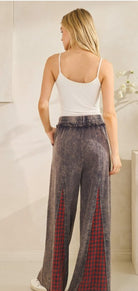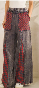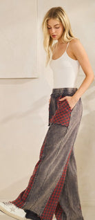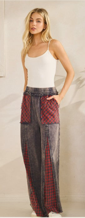 patch pockets and contrast red check plaid inserts down the legs for a true statement look. Finished with an elastic waistband, drawstring tie, and exaggerated wide leg silhouette. 100% COTTON