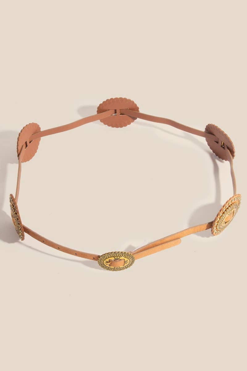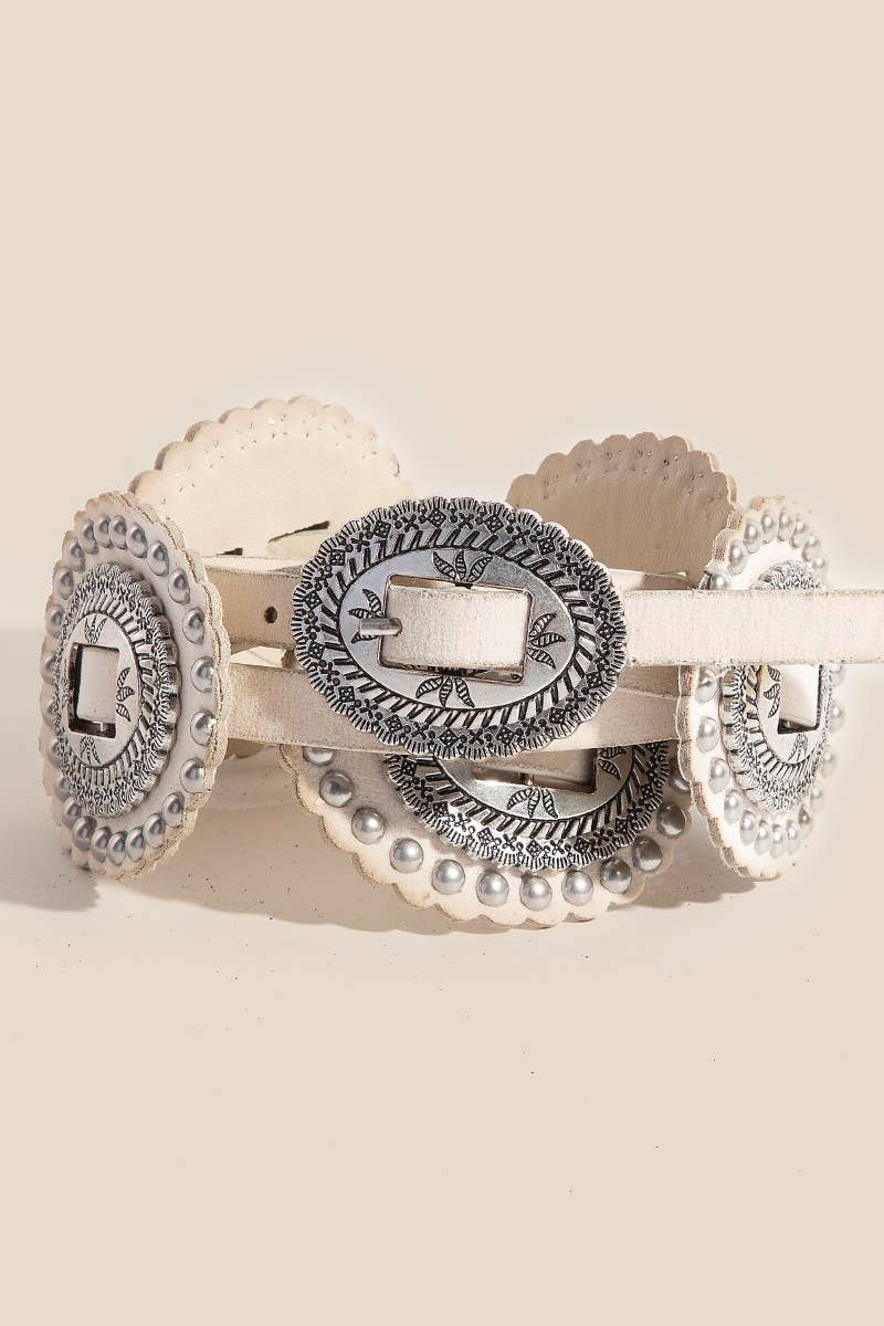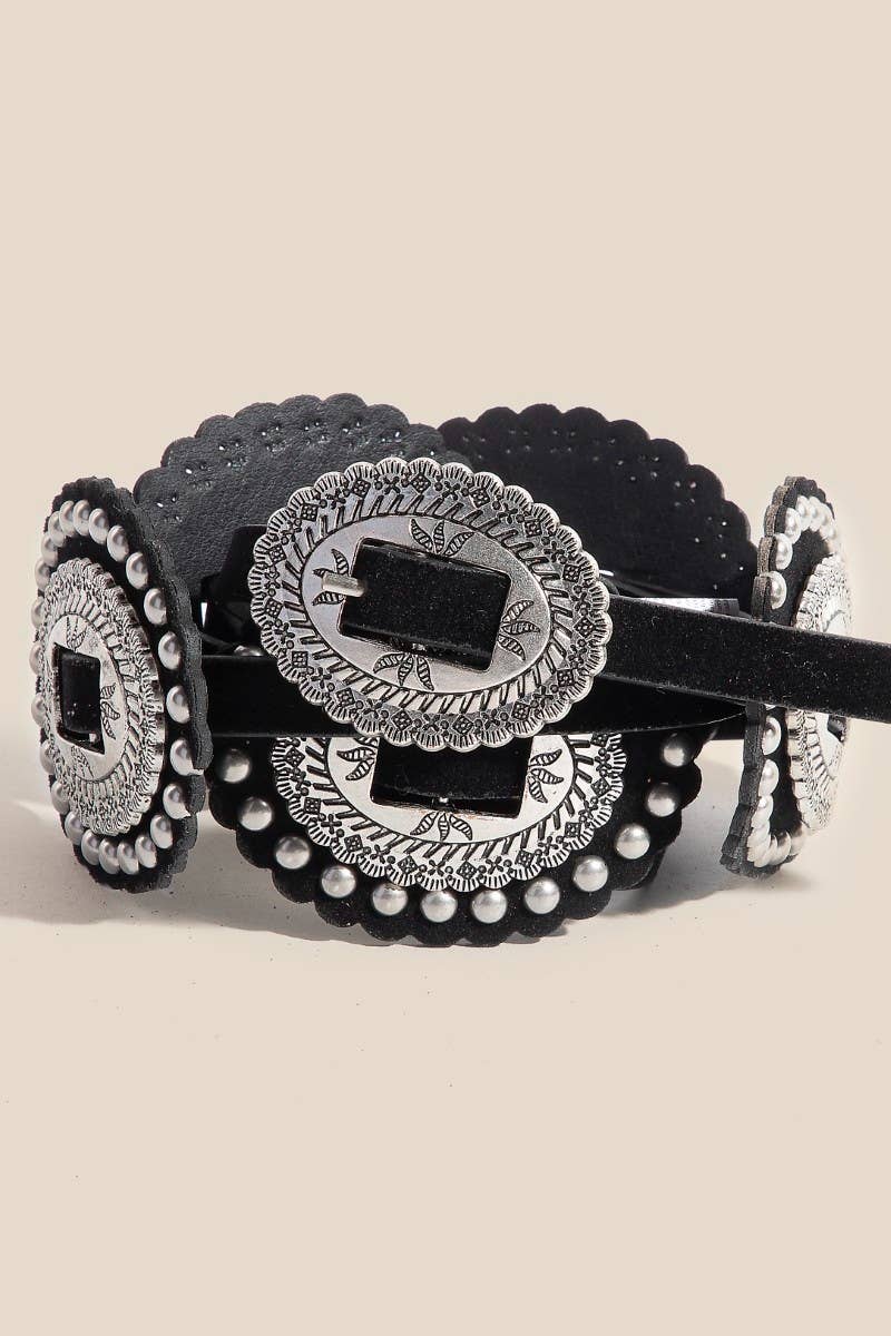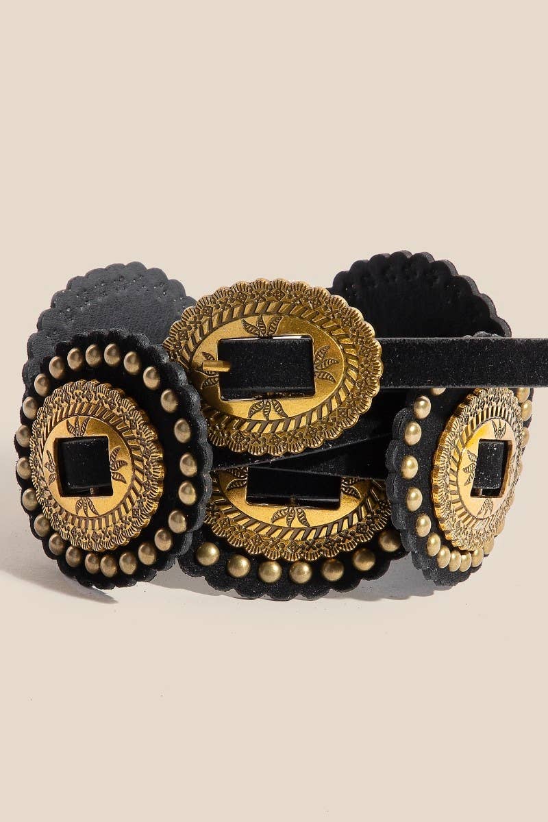 Stay on-trend and stand out from the crowd, this belt contains a special intricate faux leather concho design. Perfect for any occasion, this versatile belt will enhance any outfit you wear. This belt approximately measures: Length: 40 Inches Width: 2 Inches This belt is made with Bu:100% Alloy Vegan Leather Belt:50% Polyurethane and 50% Flannelette.