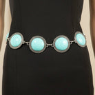 Elevate any look, this chain belt showcases a breathtaking large western concho round turquoise stone design. This item is the perfect finishing touch to any outfit, adding a touch of glamour and sophistication. This chain belt approximately measures: Length: 25 Inches Extension: 20 Inches This chain belt is made with 100% Alloy.