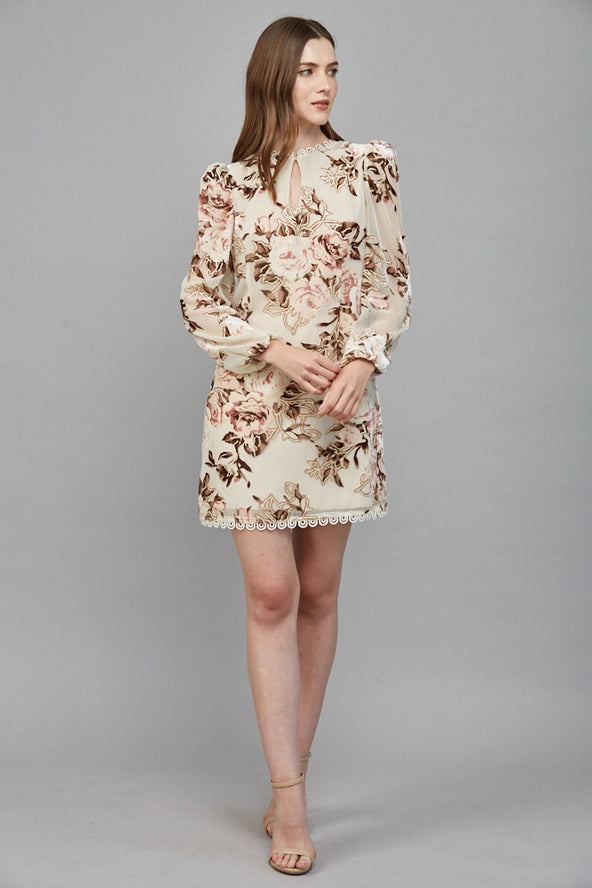 Long sleeve mini dress with scallop tape 52% rayon 48% nylon 97% polyester, 3% spandex Model height: 5’ 8”