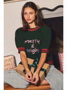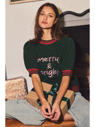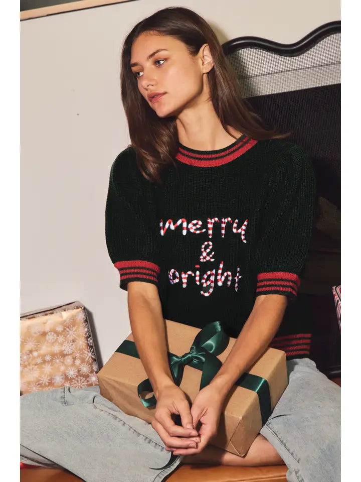 Knitted puff sleeve sweater with striped rib trims and candy cane inspired "merry & bright" lettering at front. Total Length: 22" Content: 56% Cotton, 36% Acrylic, 8% Nylon