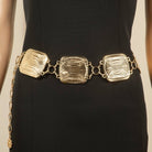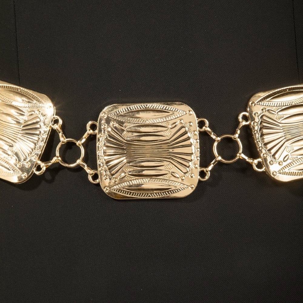 Bold and daring, this chain belt introduces an exceptional metallic western large square concho design. Elevate your fashion game with this versatile chain belt, seamlessly integrating into your signature style. Available in G, S. This item is sold in packs of 1. This chain belt approximately measures: Length: 27 Inches Extension: 15 Inches This chain belt is made with 100% Alloy.