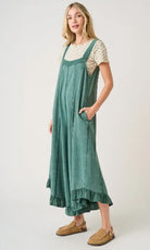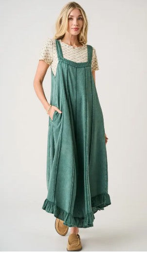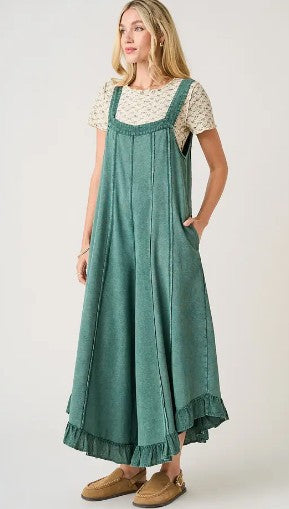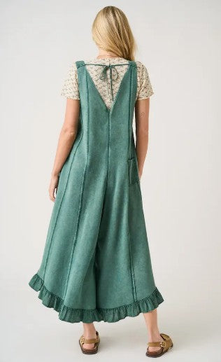- COTTON FRENCH TERRY KNIT FABRIC - MINERAL WASH - SQUARE NECK - SLEEVELESS - SEAM DETAIL THROUGHOUT - V CUT BACK WITH TIE - SIDE POCKETS - BACK POCKET - FLARED WIDE LEG WITH RUFFLE HEM - ANKLE LENGTH MODEL IS 5'8" AND WEARING SIZE SMALL