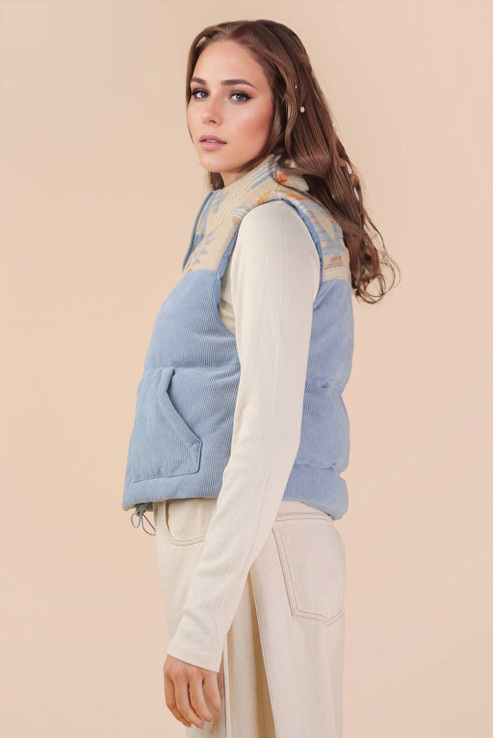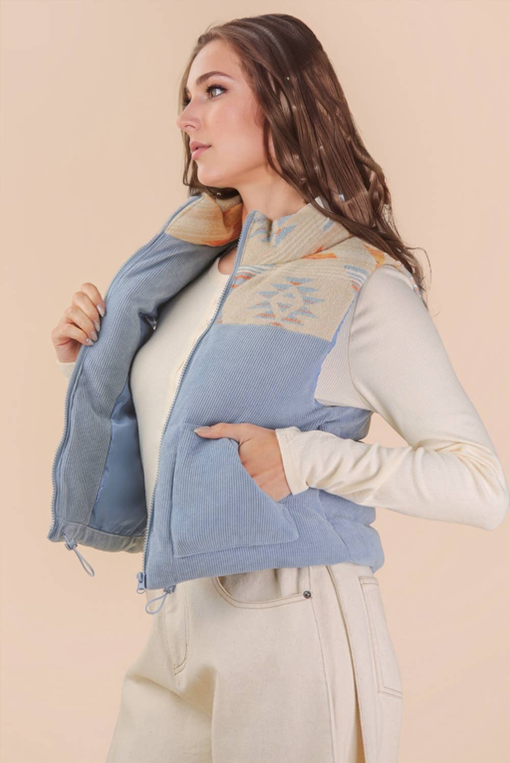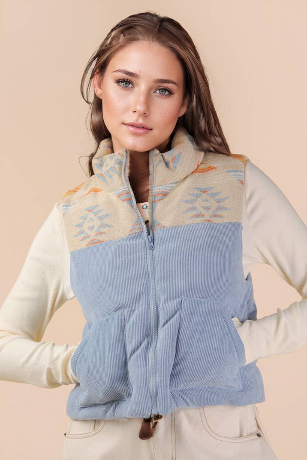 - Aztec Graphic Corduroy Casual Puffer Vest - Mock Neck - Side Pockets - Zip Up - Adjustable Strap SELF:75% COTTON,5% SPAN 20% POLYESTER