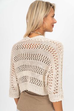 A lightweight and stylish open-knit cardigan designed for effortless layering. This cropped cardigan features a delicate crochet-style pattern with airy texture, making it perfect for warm-weather outfits or adding a touch of elegance to casual looks. The open front and ¾ sleeves provide comfort and versatility, while the soft neutral beige tone pairs beautifully with any outfit.