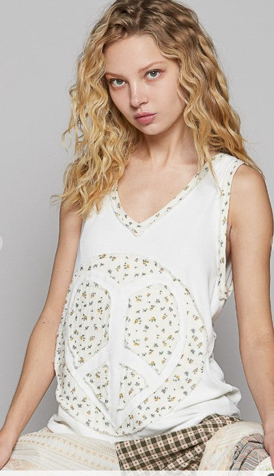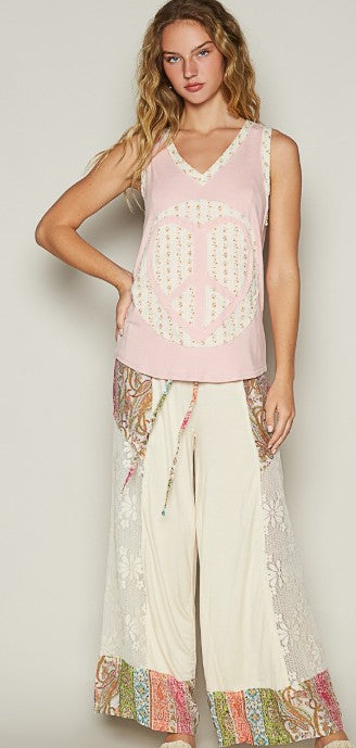 printed double gauze band, heart with peace patch, overlock stitch point,