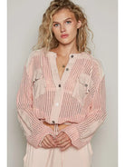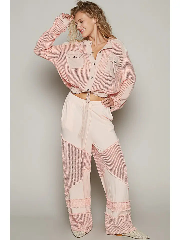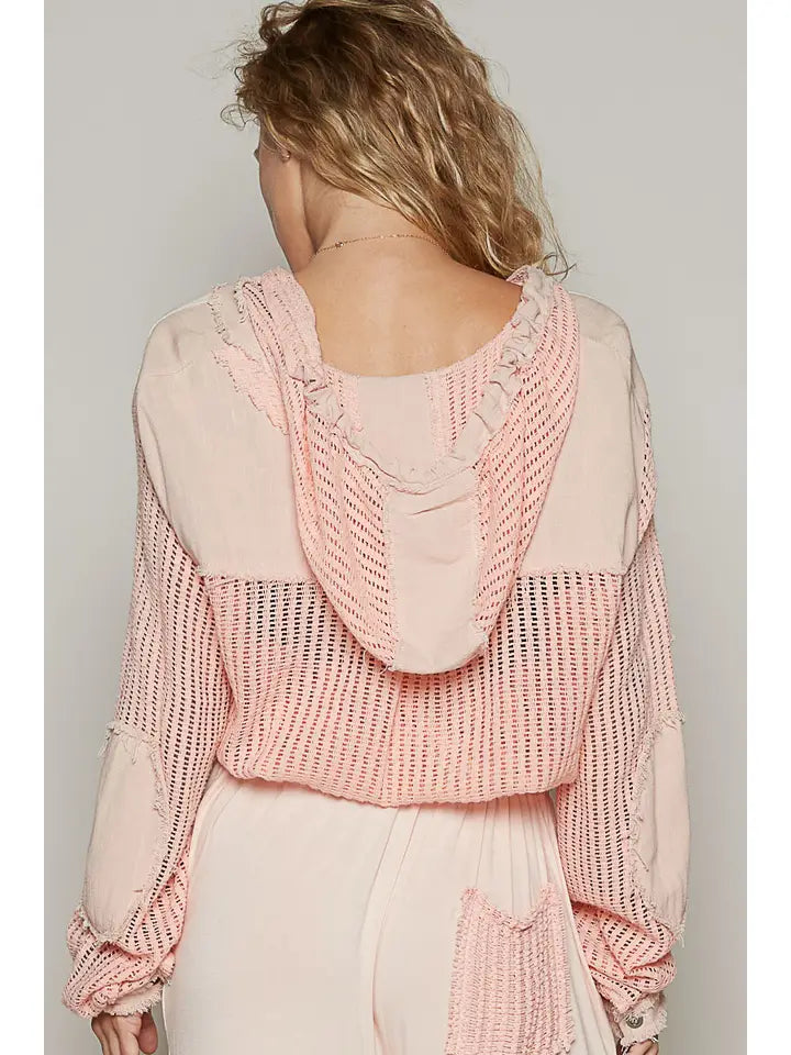 Designed in see-through button-down hoodie top, frayed edge throughout the garment, chest pocket, elbow patch. featured in textured woven * Matching Bottom: FKP96 Specs/Dimensions: - LENGTH: 22-1/2" - BUST: 23"