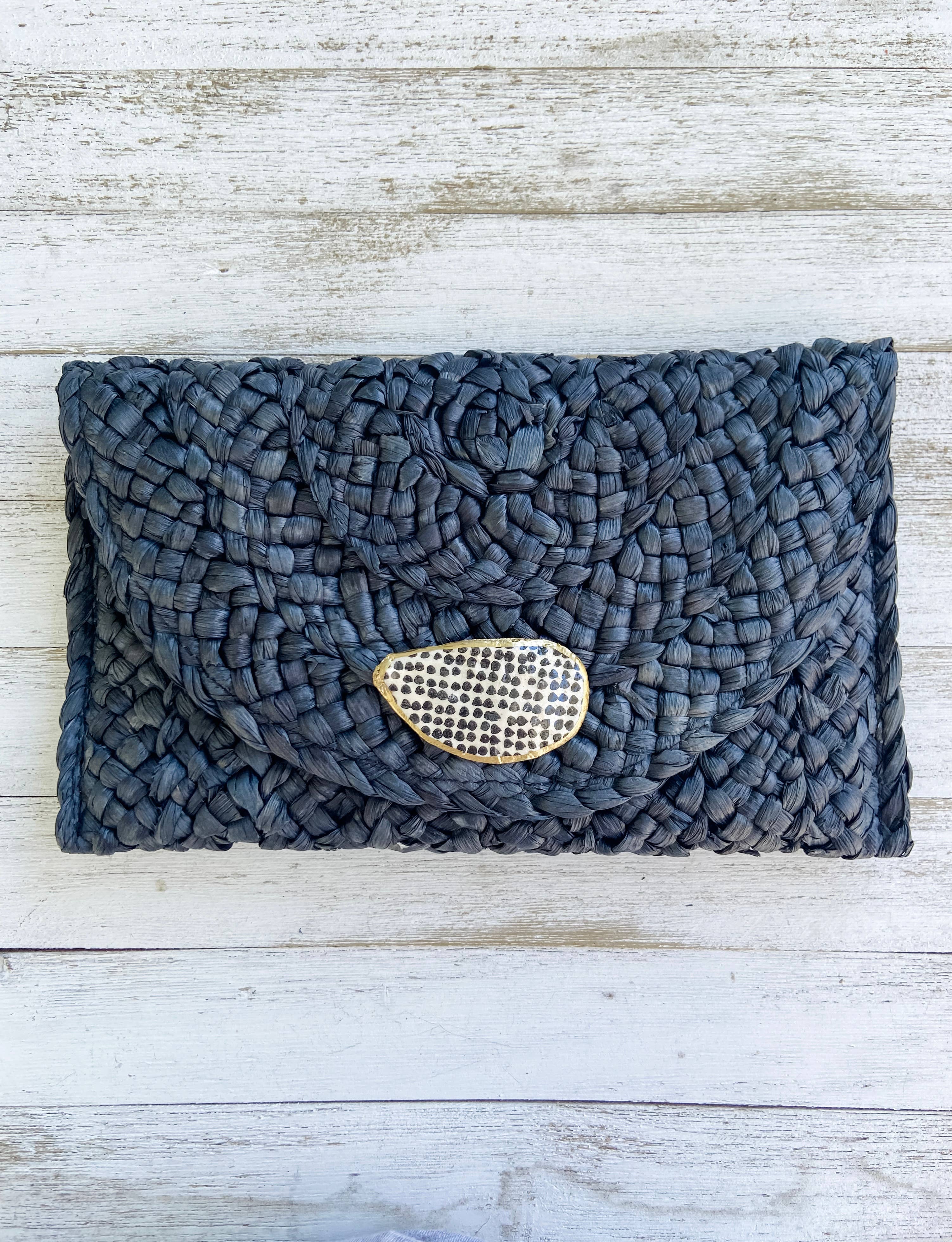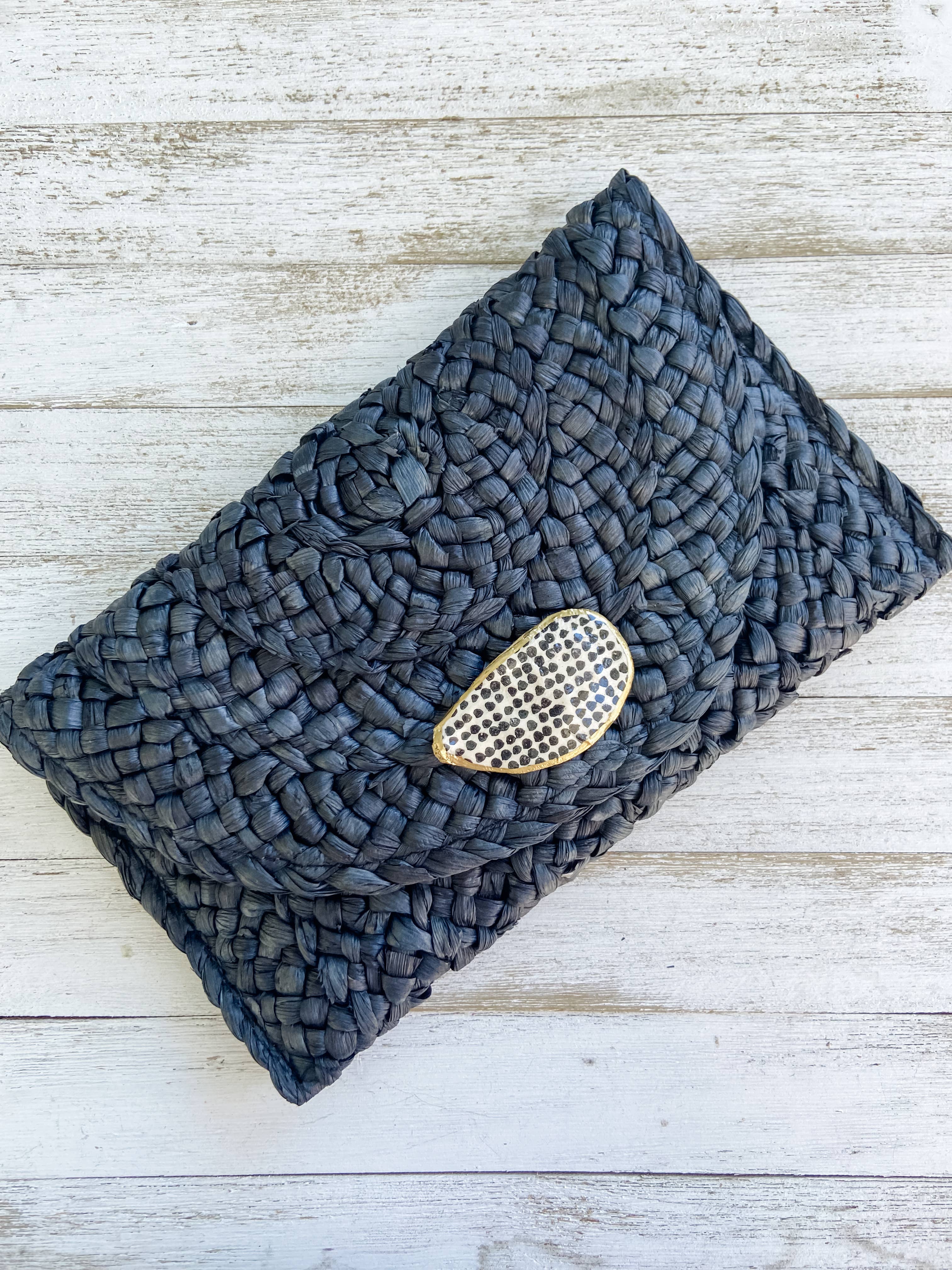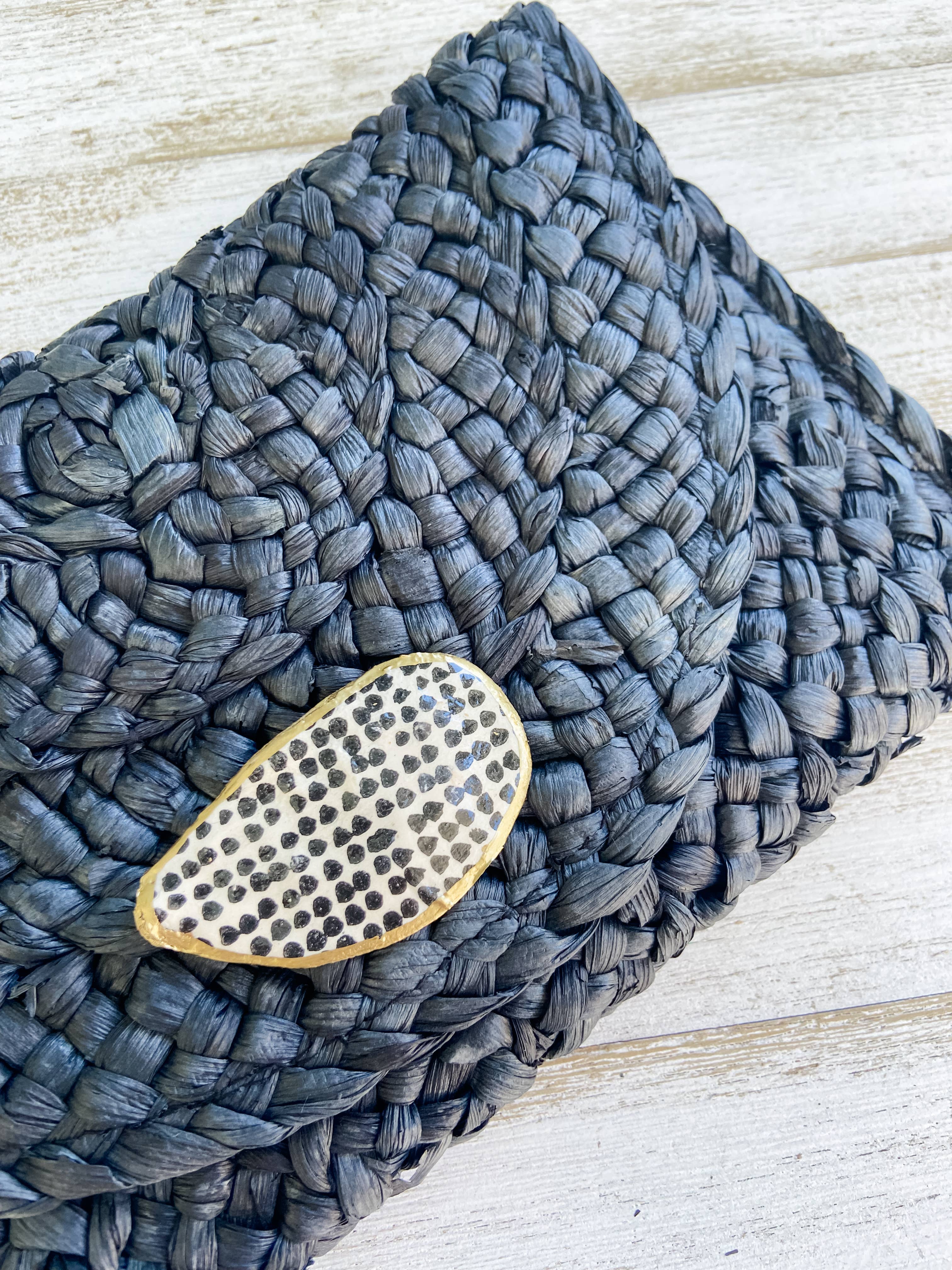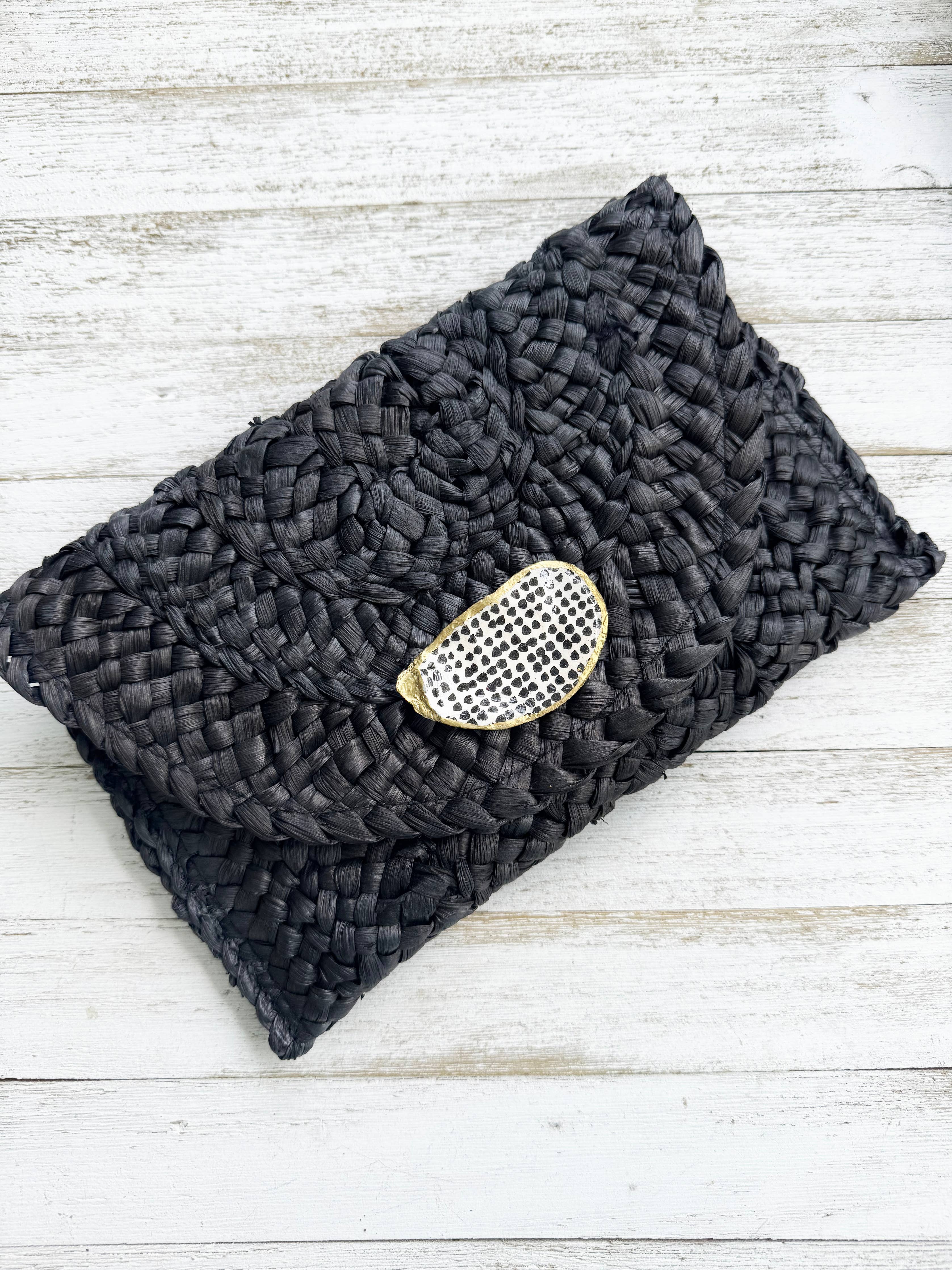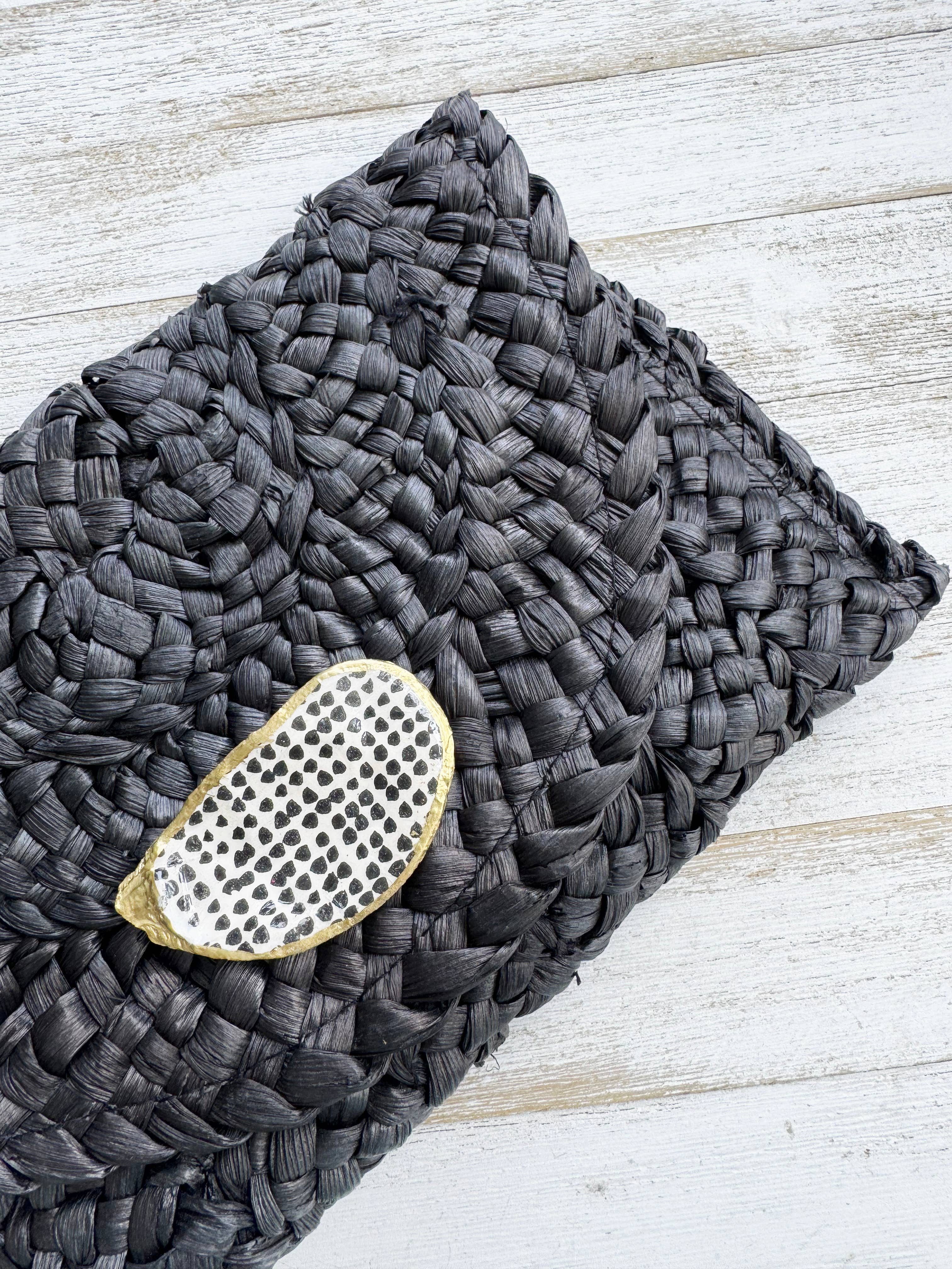 The Polka Dot Oyster Shell Clutch is crafted with a gilded oyster shell adorned with a bold polka dot print. Its black straw material and cloth lining give it a sophisticated and unique look. With a magnetic snap closure and measuring at 10x6 inches, each clutch is made to order, ensuring a one-of-a-kind piece.