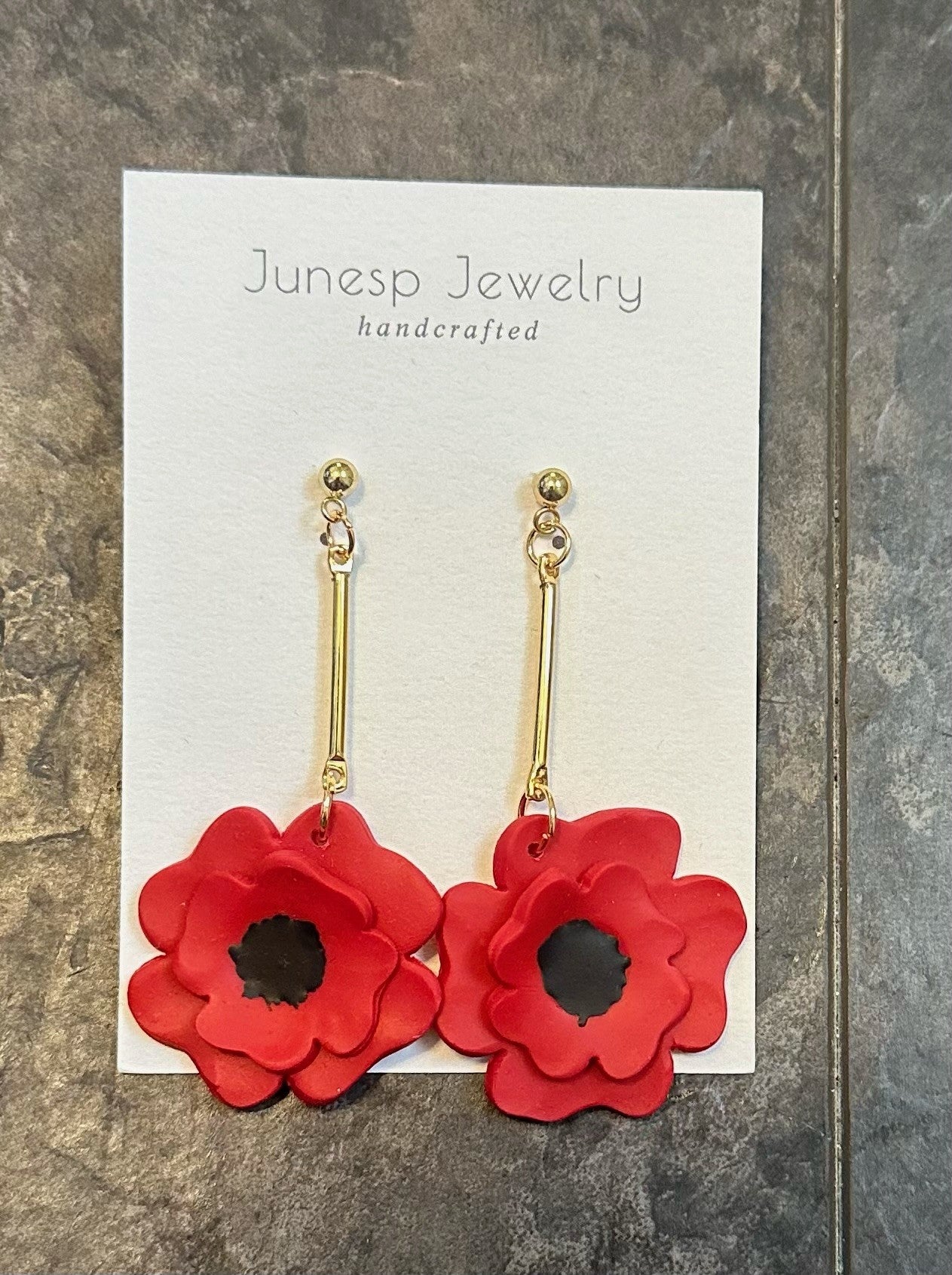 Beautiful Red Poppy earrings with gold dangle made out of Polymer Clay from our local artist.