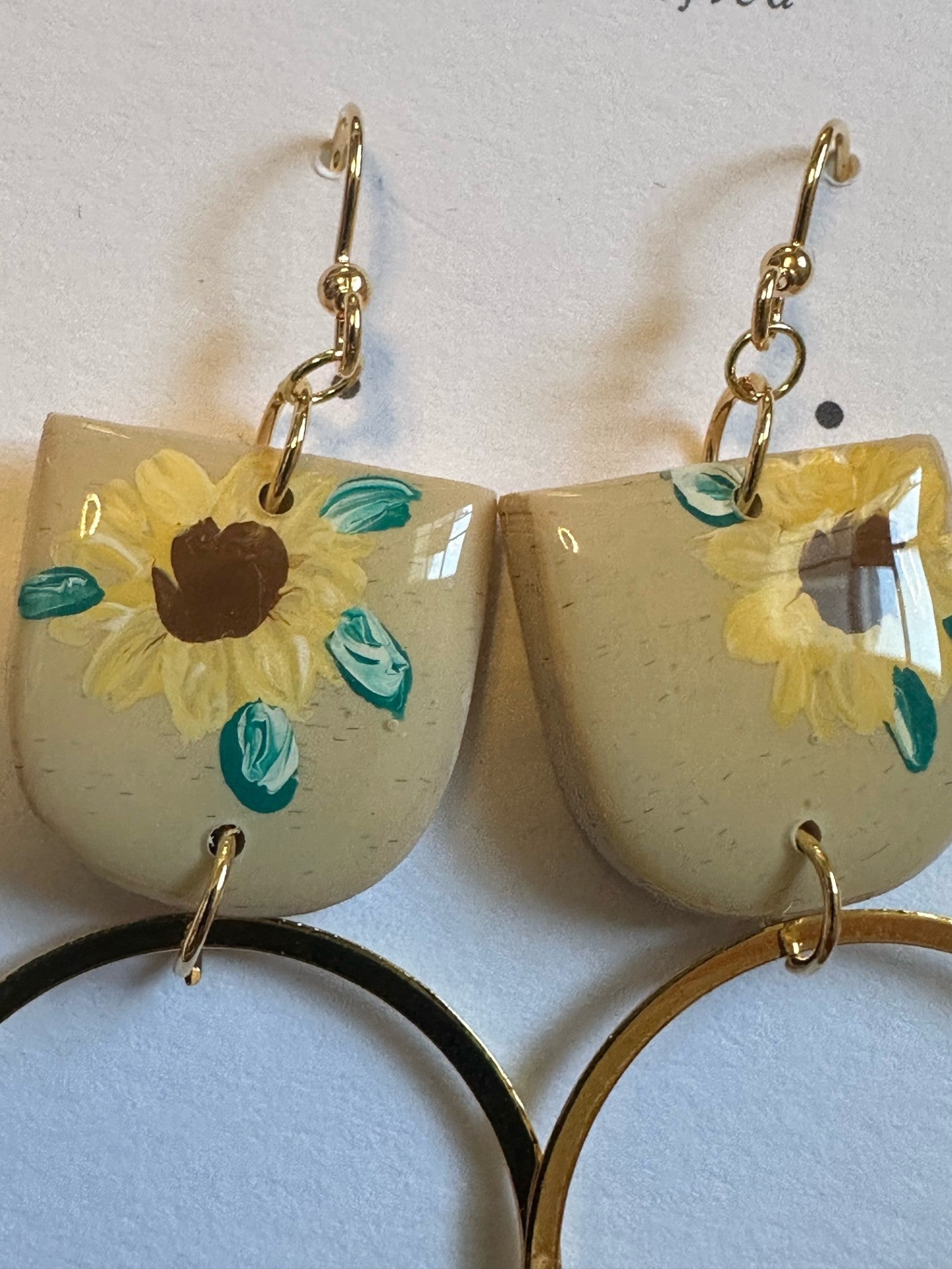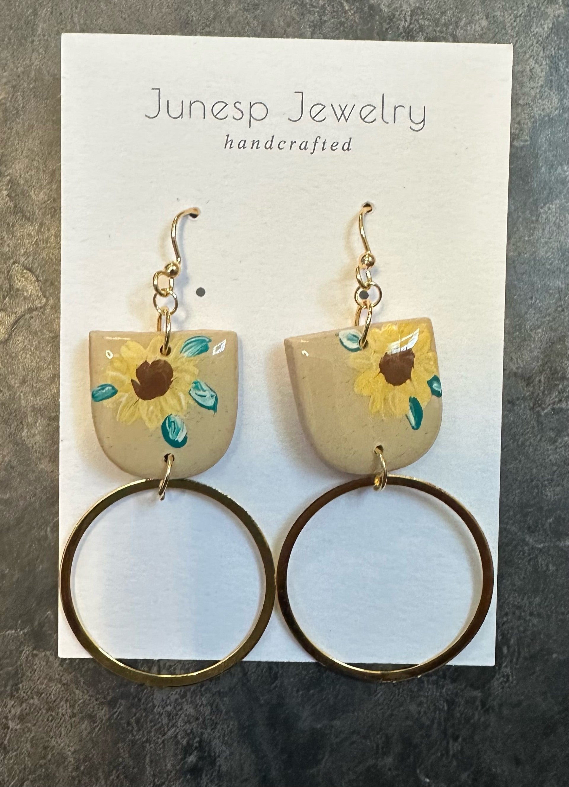 Beautiful Polymer Clay Beige Sunflower Earrings with gold circle dangle. It would look beautiful with our beige Eloise top! Made from a local artist